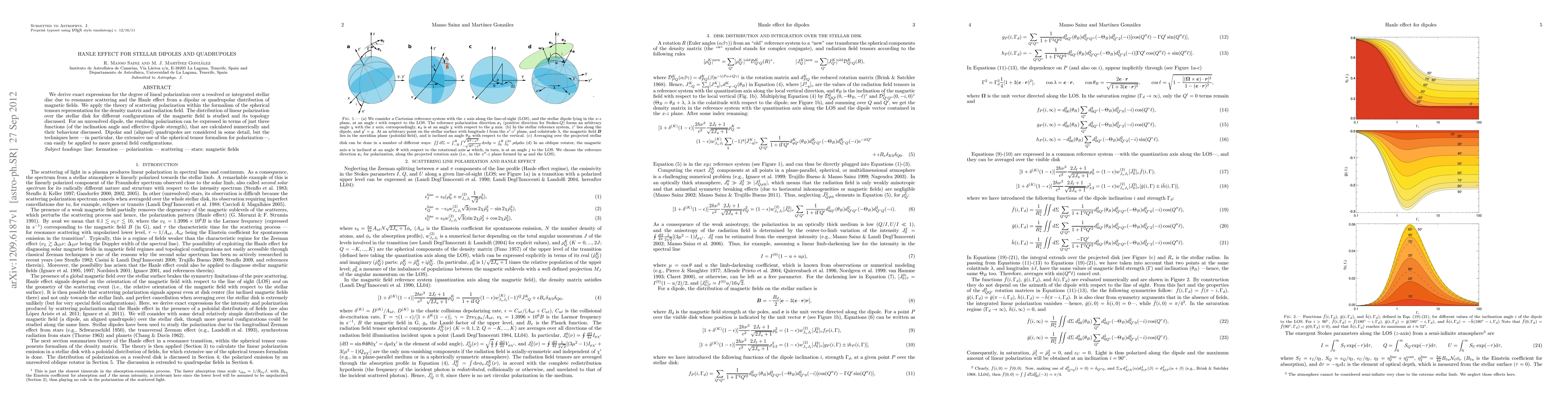 We derive exact expressions for the degree of lineal polarization over a resolved or integrated stellar disc due to resonance scattering and the Hanle effect from a dipolar or quadrupolar distribution of magnetic fields. We apply the theory of scattering polarization within the formalism of the spherical tensors representation for the density matrix and radiation field. The distribution of linear polarization over the stellar disk for different configurations of the magnetic field is studied and its topology discussed. For an unresolved dipole, the resulting polarization can be expressed in terms of just three functions (of the inclination angle and effective dipole strength), that are calculated numerically and their behaviour discussed. Dipolar and (aligned) quadrupoles are considered in some detail, but the techniques here ---in particular, the extensive use of the spherical tensor formalism for polarization---, can easily be applied to more general field configurations.
