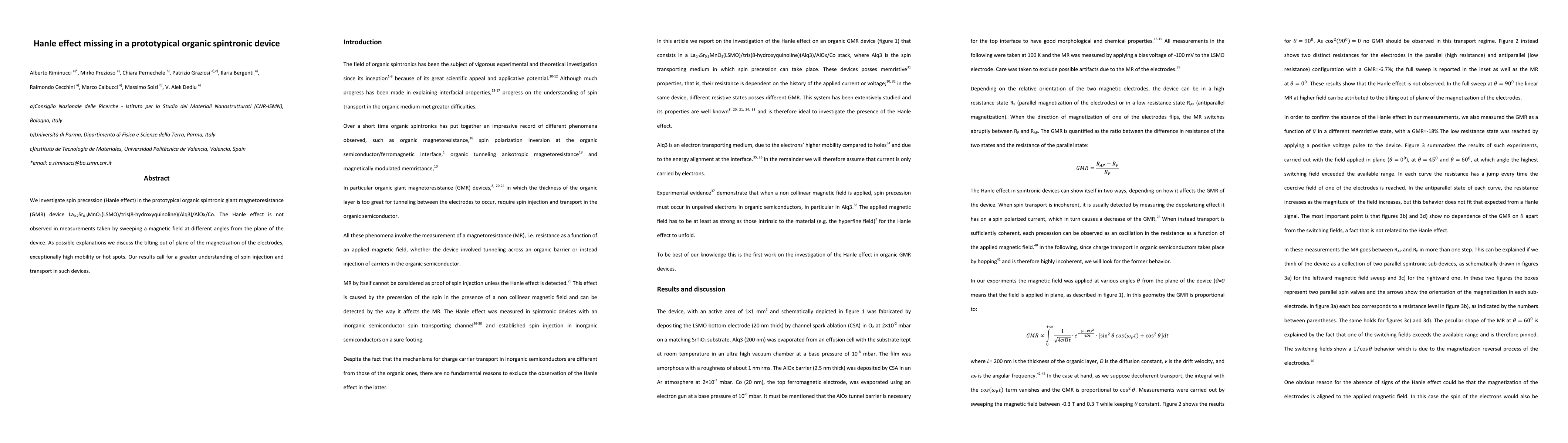 We investigate spin precession (Hanle effect) in the prototypical organic spintronic giant magnetoresistance (GMR) device La0.7Sr0.3MnO3(LSMO)/tris(8-hydroxyquinoline)(Alq3)/AlOx/Co. The Hanle effect is not observed in measurements taken by sweeping a magnetic field at different angles from the plane of the device. As possible explanations we discuss the tilting out of plane of the magnetization of the electrodes, exceptionally high mobility or hot spots. Our results call for a greater understanding of spin injection and transport in such devices.