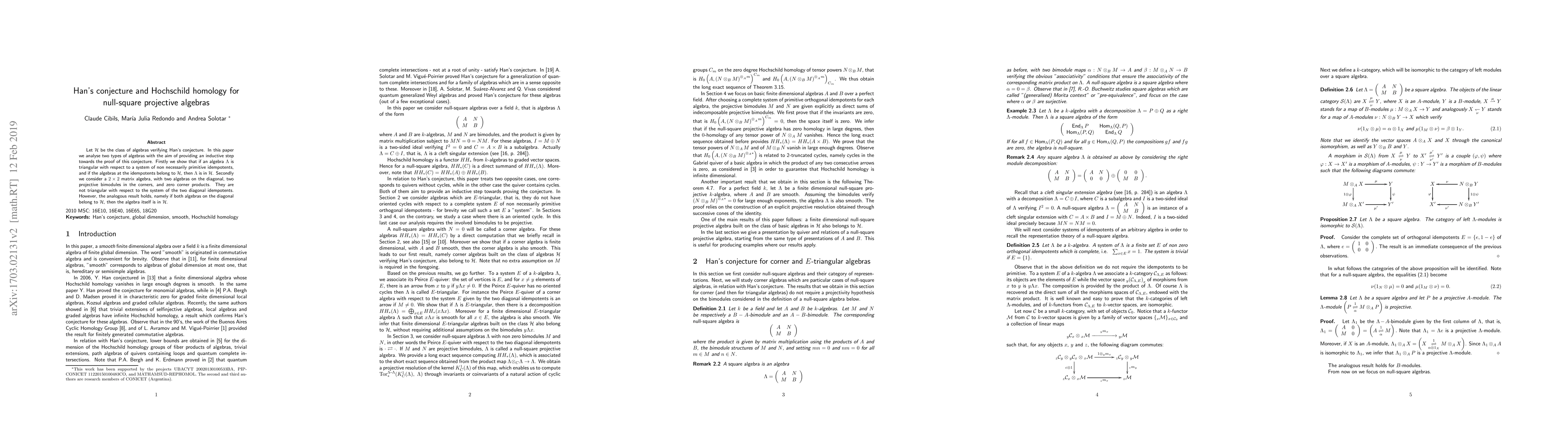 Let $\mathcal H$ be the class of algebras verifying Han's conjecture. In this paper we analyse two types of algebras with the aim of providing an inductive step towards the proof of this conjecture. Firstly we show that if an algebra $\Lambda$ is triangular with respect to a system of non necessarily primitive idempotents, and if the algebras at the idempotents belong to $\mathcal H$, then $\Lambda$ is in $\mathcal H$. Secondly we consider a $2\times 2$ matrix algebra, with two algebras on the diagonal, two projective bimodules in the corners, and zero corner products. They are not triangular with respect to the system of the two diagonal idempotents. However, the analogous result holds, namely if both algebras on the diagonal belong to $\mathcal H$, then the algebra itself is in $\mathcal H$.