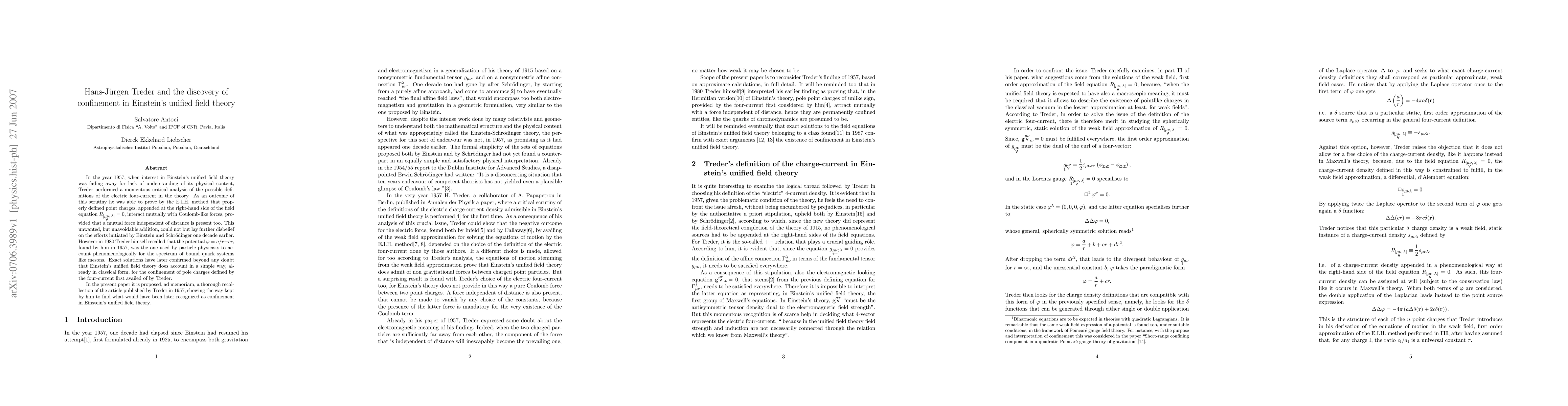 Hans-Juergen Treder's 1957 critical analysis of Einstein's unified field theory led to the discovery of confinement, a phenomenon later confirmed in classical solutions. Treder's work, initially dismissed, laid the groundwork for understanding the mutual interaction of point charges and the presence of a distance-independent force.