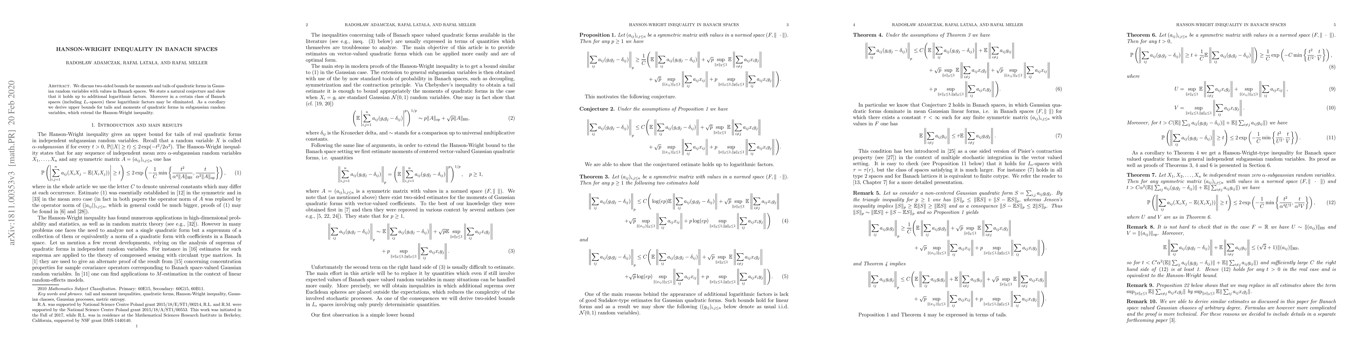 The paper establishes two-sided bounds for moments and tails of quadratic forms in Gaussian random variables within Banach spaces, proving a conjecture up to logarithmic factors. For specific Banach spaces, including $L_r$-spaces, these factors are eliminated, leading to extended Hanson-Wright inequalities for subgaussian random variables.