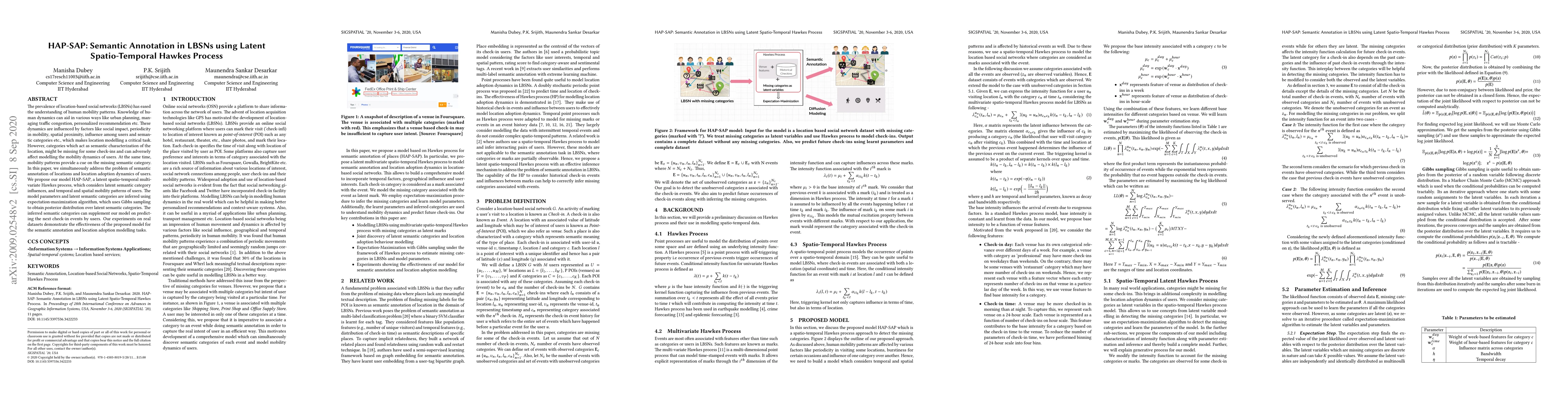 The paper proposes HAP-SAP, a latent spatio-temporal multivariate Hawkes process model to address the semantic annotation of locations and the dynamics of user mobility in LBSNs. The model infers latent semantic categories and parameters using an expectation-maximization algorithm with Gibbs sampling, demonstrating effectiveness in predicting user check-in events.