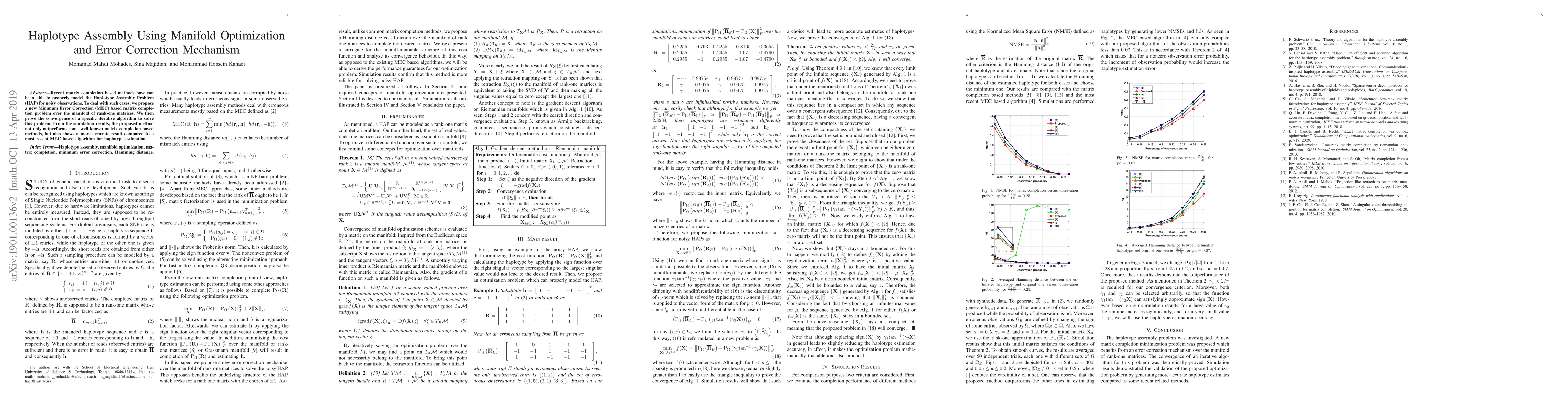 Recent matrix completion based methods have not been able to properly model the Haplotype Assembly Problem (HAP) for noisy observations. To cope with such a case, in this letter we propose a new Minimum Error Correction (MEC) based matrix completion optimization problem over the manifold of rank-one matrices. The convergence of a specific iterative algorithm for solving this problem is proved. Simulation results illustrate that the proposed method not only outperforms some well-known matrix completion based methods, but also presents a more accurate result compared to a most recent MEC based algorithm for haplotype estimation.
