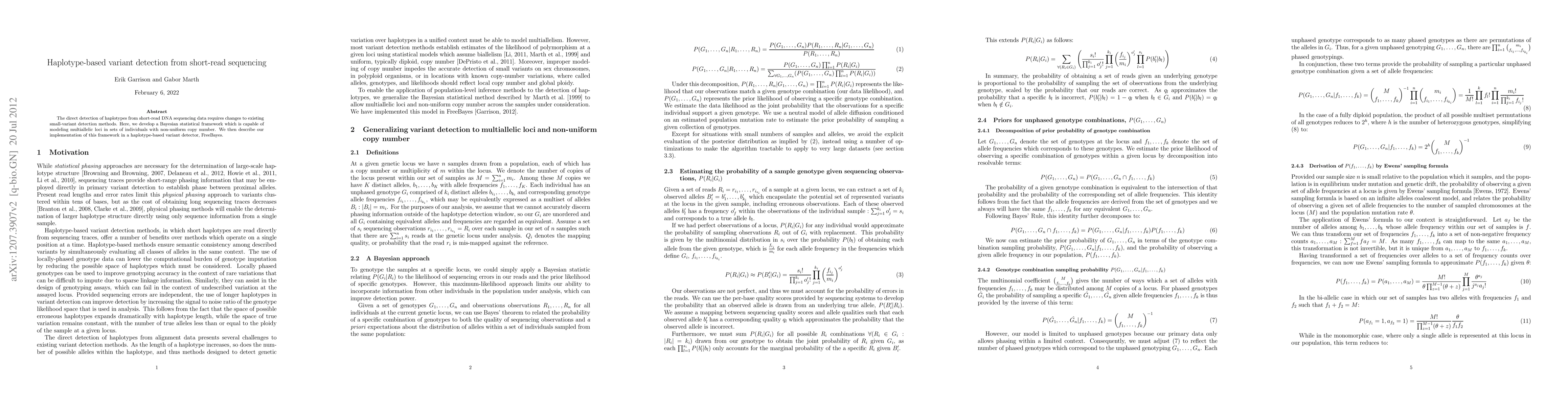 The direct detection of haplotypes from short-read DNA sequencing data requires changes to existing small-variant detection methods. Here, we develop a Bayesian statistical framework which is capable of modeling multiallelic loci in sets of individuals with non-uniform copy number. We then describe our implementation of this framework in a haplotype-based variant detector, FreeBayes.
