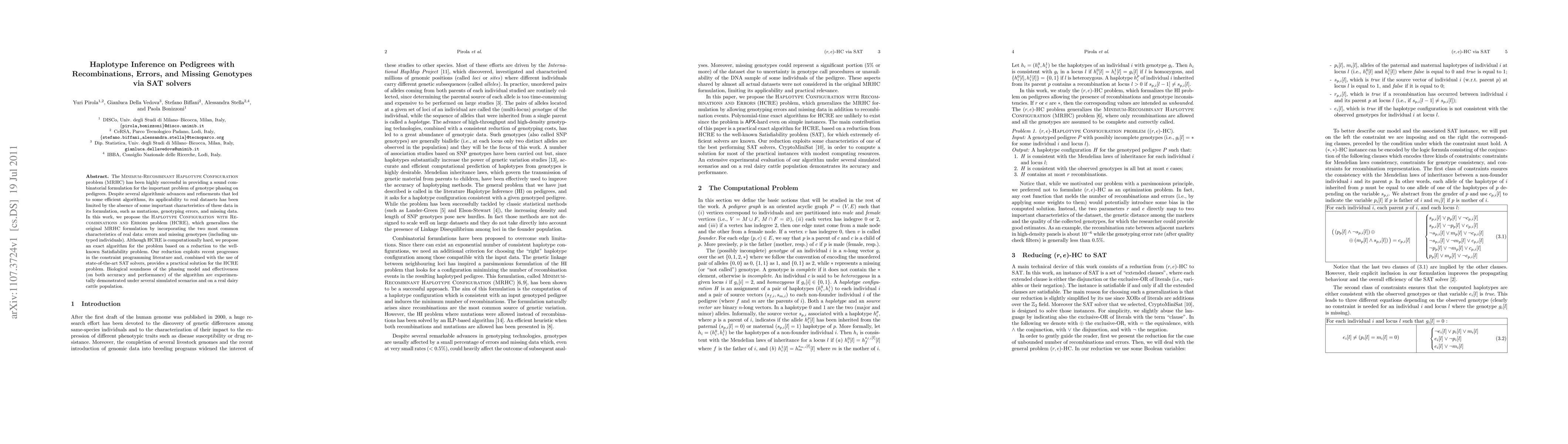 This paper proposes a new problem, Haplotype Configuration with Recombinations and Errors (HCRE), to generalize the Minimum-Recombinant Haplotype Configuration problem by incorporating genotyping errors and missing genotypes. An exact algorithm based on SAT solvers is introduced to solve HCRE, demonstrating biological soundness and effectiveness through simulations and real data analysis.