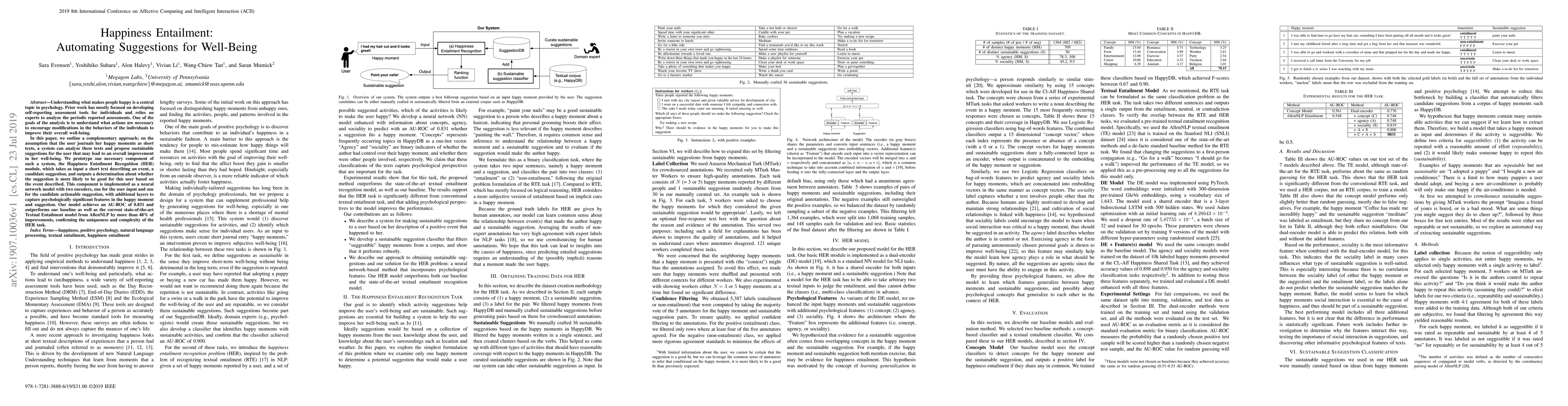 This paper proposes a system to automate well-being suggestions based on users' journaled happy moments, introducing a Happiness Entailment Recognition (HER) module that uses a neural network to determine if a suggestion aligns with the user's past experiences. The HER module aims to identify sustainable actions that can enhance overall well-being.