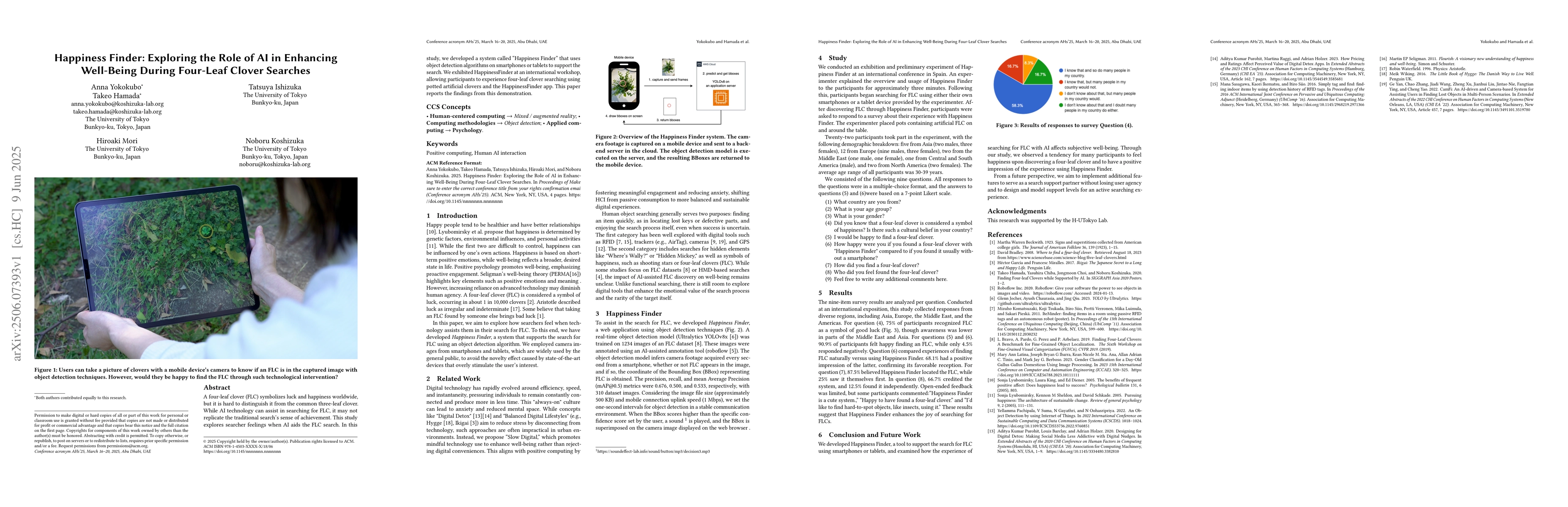 The paper introduces 'Happiness Finder,' an AI-powered app aiding four-leaf clover searches using object detection. The study, conducted at an international workshop, reveals insights into user feelings and experiences when AI assists in this traditional luck-seeking activity.