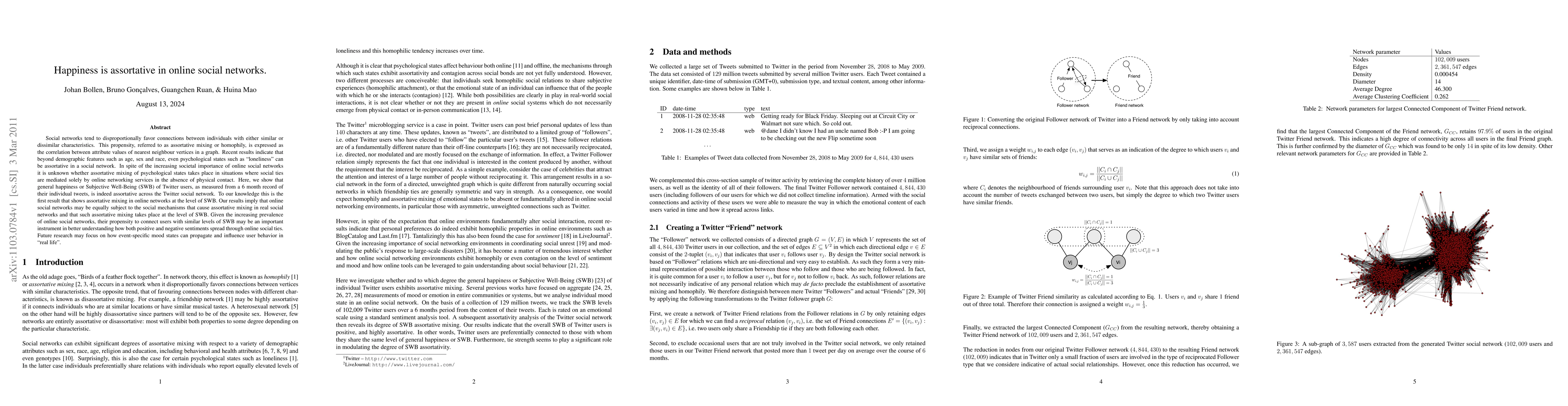This study demonstrates that general happiness, or Subjective Well-Being (SWB), among Twitter users is assortative across the online social network, indicating that people with similar levels of happiness tend to connect. This finding suggests that online social networks may replicate the social mechanisms that lead to assortative mixing in real-world social networks, potentially influencing how positive and negative sentiments spread online.