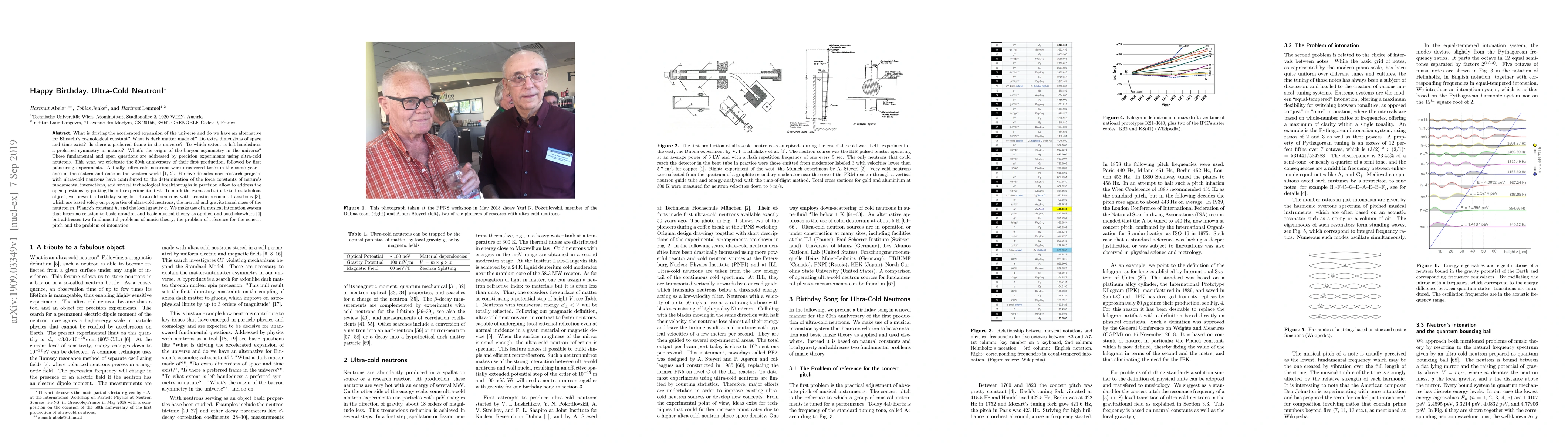What is driving the accelerated expansion of the universe and do we have an alternative for Einstein's cosmological constant? What is dark matter made of? Do extra dimensions of space and time exist? Is there a preferred frame in the universe? To which extent is left-handedness a preferred symmetry in nature? What's the origin of the baryon asymmetry in the universe? These fundamental and open questions are addressed by precision experiments using ultra-cold neutrons. This year, we celebrate the 50th anniversary of their first production, followed by first pioneering experiments. Actually, ultra-cold neutrons were discovered twice in the same year, once in the eastern and once in the western world. For five decades now research projects with ultra-cold neutrons have contributed to the determination of the force constants of nature's fundamental interactions, and several technological breakthroughs in precision allow to address the open questions by putting them to experimental test. To mark the event and tribute to this fabulous object, we present a birthday song for ultra-cold neutrons with acoustic resonant transitions, which are based solely on properties of ultra-cold neutrons, the inertial and gravitational mass of the neutron, Planck's constant, and the local gravity. We make use of a musical intonation system that bears no relation to basic notation and basic musical theory as applied and used elsewhere but addresses two fundamental problems of music theory, the problem of reference for the concert pitch and the problem of intonation.
