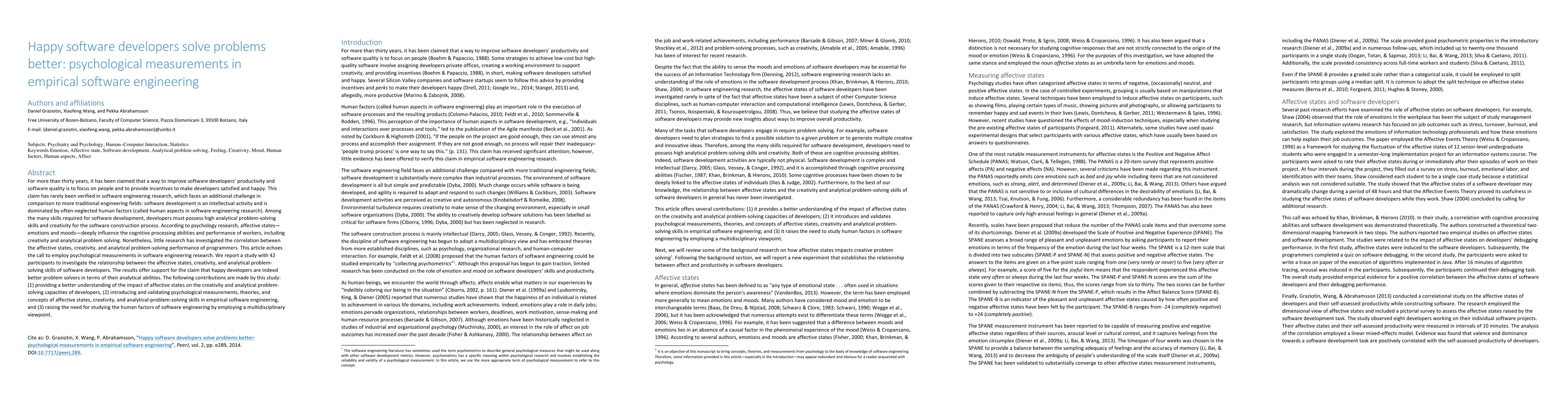 This study investigates the correlation between software developers' affective states and their creativity and problem-solving skills, finding that happier developers perform better analytically. It contributes by validating psychological measurements in software engineering and emphasizes the importance of human factors in the field.