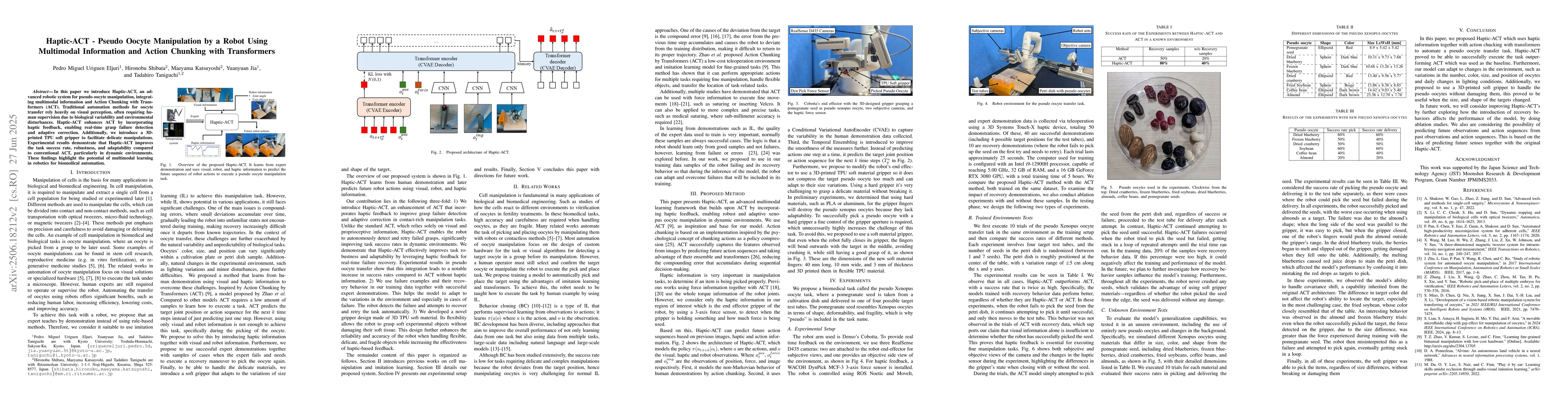 The paper presents Haptic-ACT, a robotic system for handling pseudo oocytes using multimodal information and Action Chunking with Transformers (ACT). It introduces a soft gripper and haptic feedback for real-time adjustments, significantly improving success rates and adaptability in dynamic environments, showcasing the potential of multimodal learning in biomedical robotics.