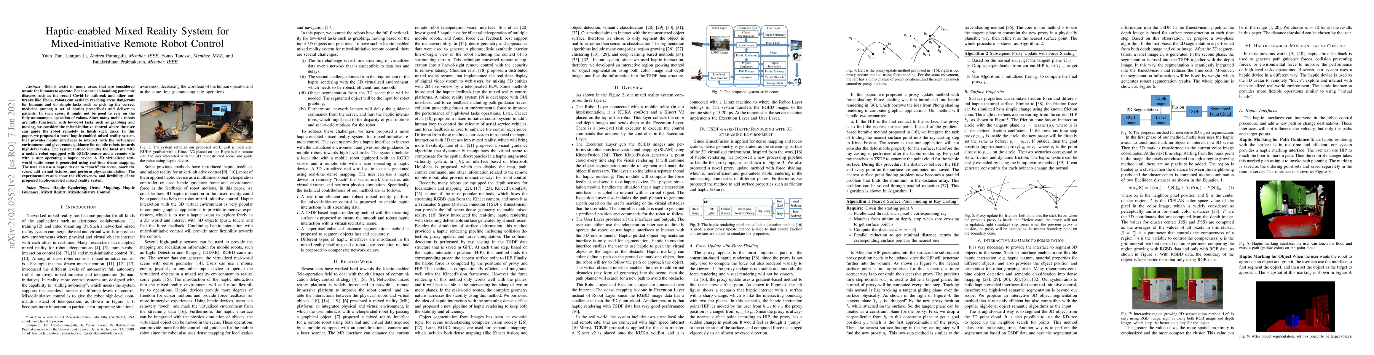 This paper proposes a haptic-enabled mixed reality system for mixed-initiative remote control of mobile robots, particularly useful in hazardous environments like pandemic outbreaks. The system enhances robot teleoperations by providing users with immersive 3D visualization and haptic feedback, enabling more effective remote guidance for complex tasks.