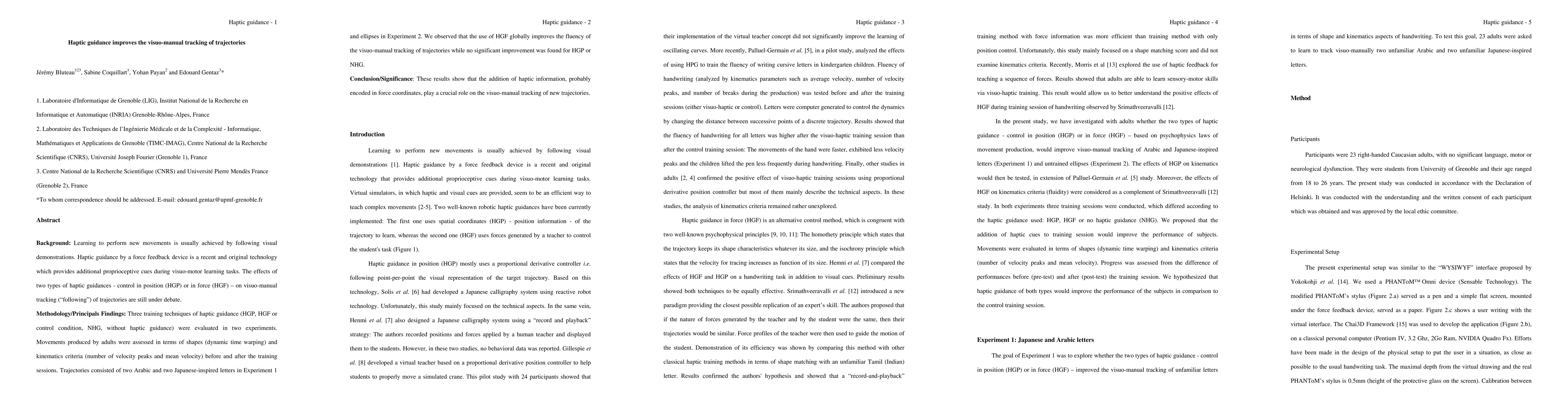 BACKGROUND: Learning to perform new movements is usually achieved by following visual demonstrations. Haptic guidance by a force feedback device is a recent and original technology which provides additional proprioceptive cues during visuo-motor learning tasks. The effects of two types of haptic guidances-control in position (HGP) or in force (HGF)-on visuo-manual tracking ("following") of trajectories are still under debate. METHODOLOGY/PRINCIPALS FINDINGS: Three training techniques of haptic guidance (HGP, HGF or control condition, NHG, without haptic guidance) were evaluated in two experiments. Movements produced by adults were assessed in terms of shapes (dynamic time warping) and kinematics criteria (number of velocity peaks and mean velocity) before and after the training sessions. CONCLUSION/SIGNIFICANCE: These results show that the addition of haptic information, probably encoded in force coordinates, play a crucial role on the visuo-manual tracking of new trajectories.