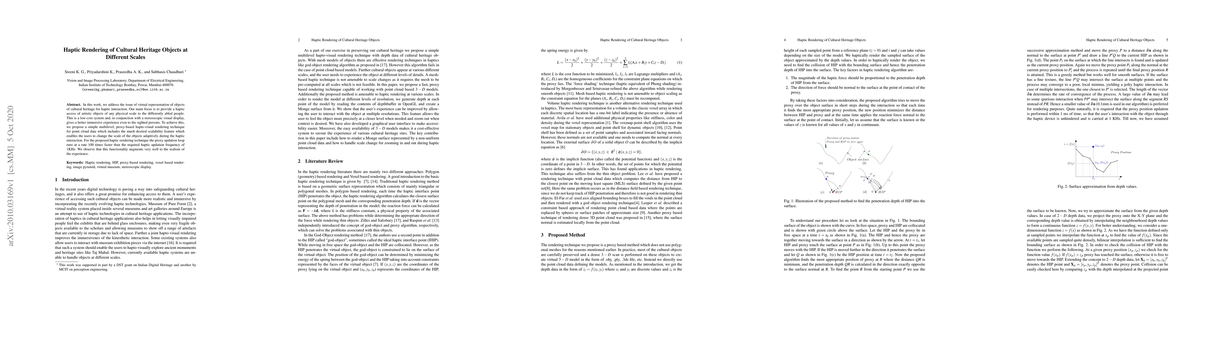 The paper proposes a multilevel, proxy-based haptic rendering technique for point cloud data of cultural heritage objects, enabling adaptive scaling for different physical object sizes and integration with stereoscopic visual displays for an immersive experience.