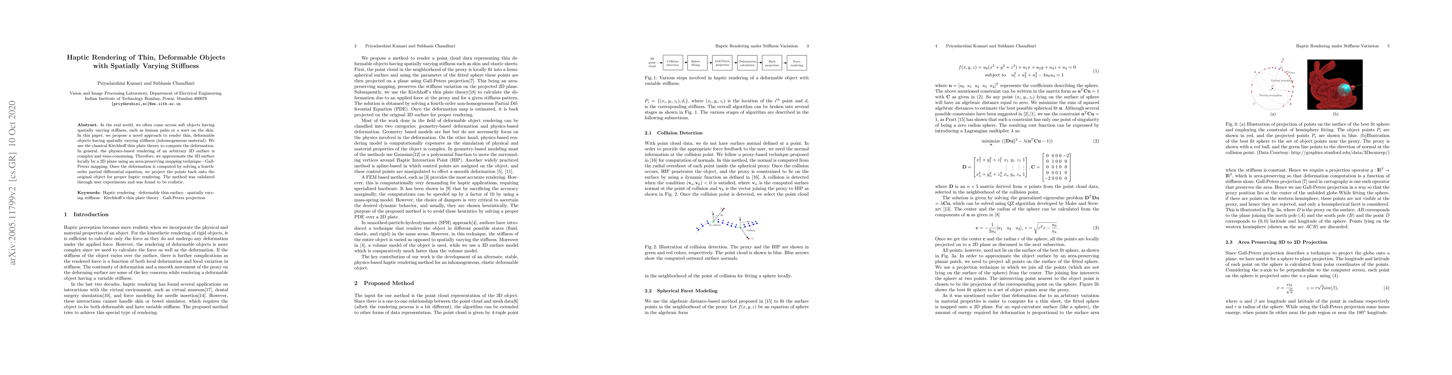 This paper presents a novel approach for rendering thin, deformable objects with spatially varying stiffness using Kirchhoff thin plate theory and an area-preserving Gall-Peters mapping. The method simplifies the physics-based rendering process and was validated through user experiments to be realistic.