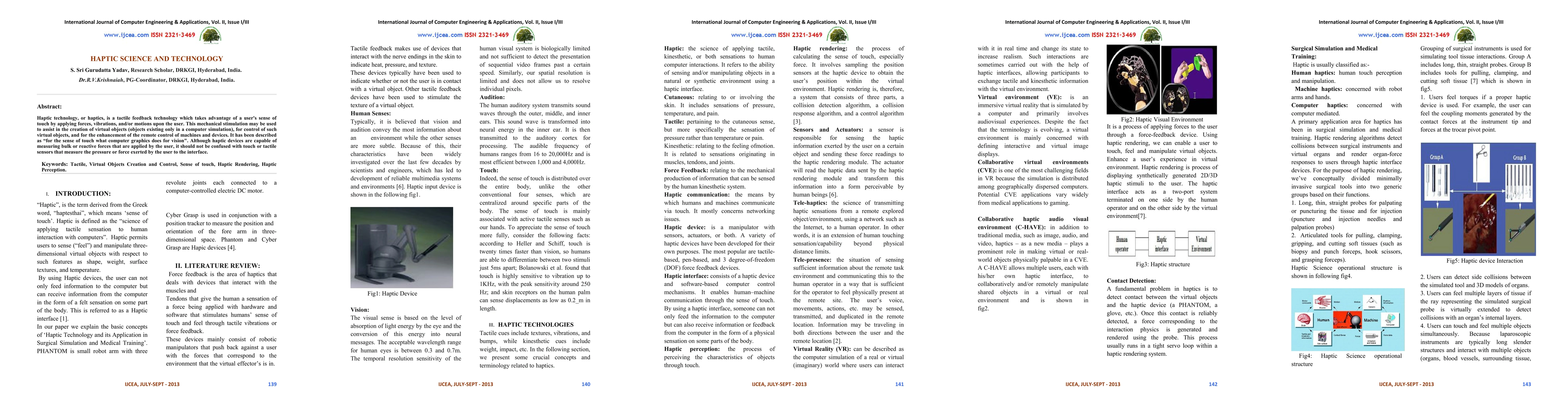 Haptic technology, or haptics, is a tactile feedback technology which takes advantage of a user's sense of touch by applying forces, vibrations, and/or motions upon the user. This mechanical stimulation may be used to assist in the creation of virtual objects (objects existing only in a computer simulation), for control of such virtual objects, and for the enhancement of the remote control of machines and devices. It has been described as for the sense of touch what computer graphics does for vision. Although haptic devices are capable of measuring bulk or reactive forces that are applied by the user, it should not be confused with touch or tactile sensors that measure the pressure or force exerted by the user to the interface.