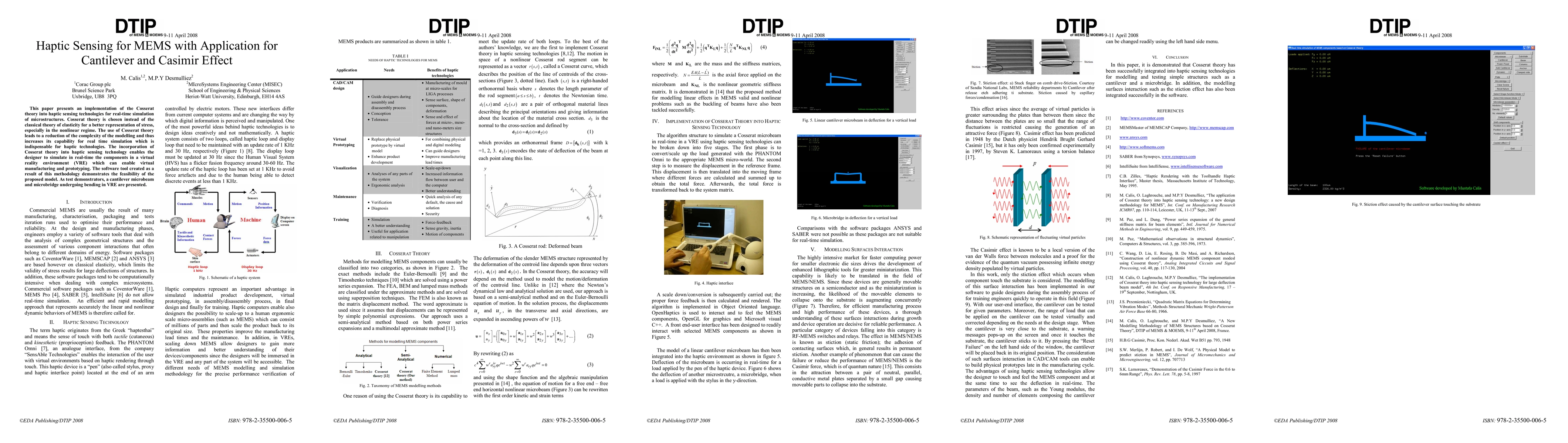 This paper presents an implementation of the Cosserat theory into haptic sensing technologies for real-time simulation of microstructures. Cosserat theory is chosen instead of the classical theory of elasticity for a better representation of stress, especially in the nonlinear regime. The use of Cosserat theory leads to a reduction of the complexity of the modelling and thus increases its capability for real time simulation which is indispensable for haptic technologies. The incorporation of Cosserat theory into haptic sensing technology enables the designer to simulate in real-time the components in a virtual reality environment (VRE) which can enable virtual manufacturing and prototyping. The software tool created as a result of this methodology demonstrates the feasibility of the proposed model. As test demonstrators, a cantilever microbeam and microbridge undergoing bending in VRE are presented.