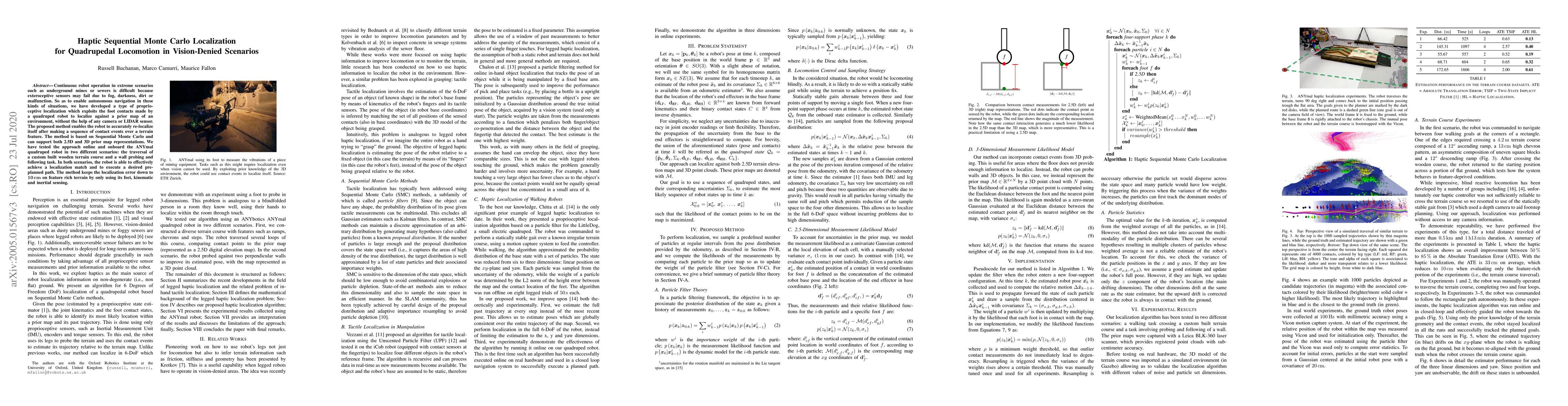 Continuous robot operation in extreme scenarios such as underground mines or sewers is difficult because exteroceptive sensors may fail due to fog, darkness, dirt or malfunction. So as to enable autonomous navigation in these kinds of situations, we have developed a type of proprioceptive localization which exploits the foot contacts made by a quadruped robot to localize against a prior map of an environment, without the help of any camera or LIDAR sensor. The proposed method enables the robot to accurately re-localize itself after making a sequence of contact events over a terrain feature. The method is based on Sequential Monte Carlo and can support both 2.5D and 3D prior map representations. We have tested the approach online and onboard the ANYmal quadruped robot in two different scenarios: the traversal of a custom built wooden terrain course and a wall probing and following task. In both scenarios, the robot is able to effectively achieve a localization match and to execute a desired pre-planned path. The method keeps the localization error down to 10cm on feature rich terrain by only using its feet, kinematic and inertial sensing.