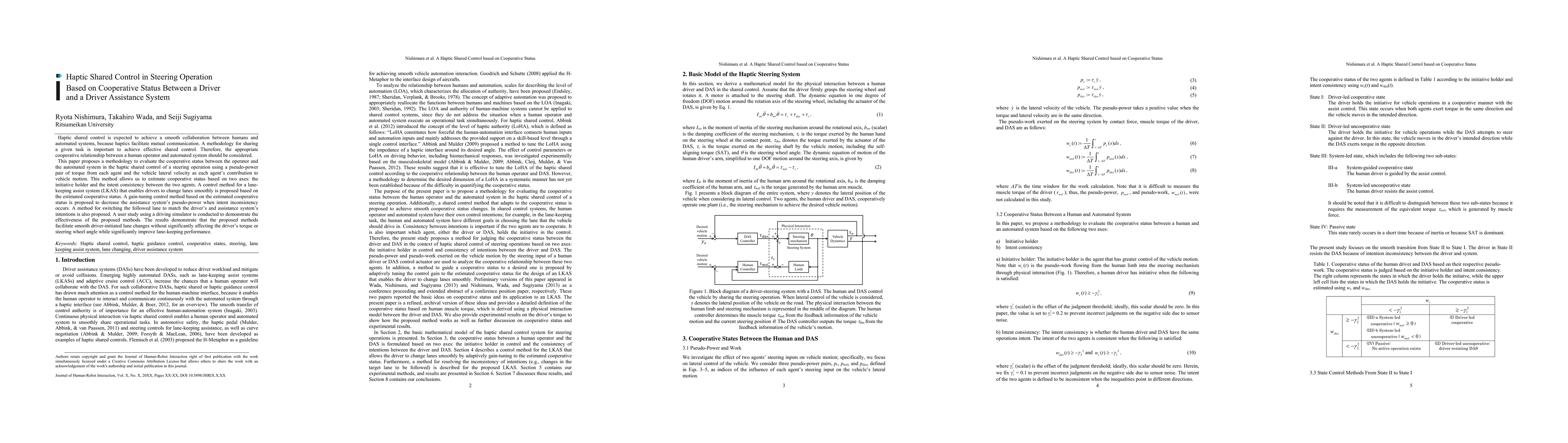 This paper proposes a methodology for haptic shared control in steering operations, evaluating the cooperative status between drivers and automated systems based on initiative and intent consistency. The study introduces a control method for lane-keeping assist systems to enable smooth lane changes, demonstrating improved lane-keeping performance through a driving simulator user study.