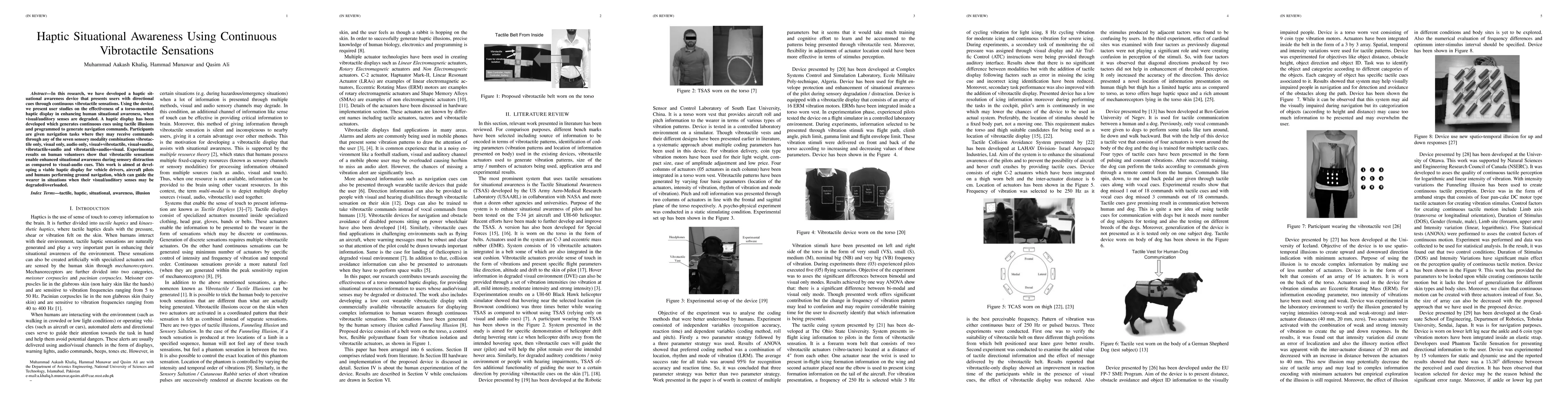 This study develops a torso-mounted haptic display that uses continuous vibrotactile sensations to enhance situational awareness in scenarios with degraded visual/auditory senses. Experimental results show that vibrotactile cues outperform visual-audio cues in improving awareness, suggesting potential applications for drivers, pilots, and navigators.