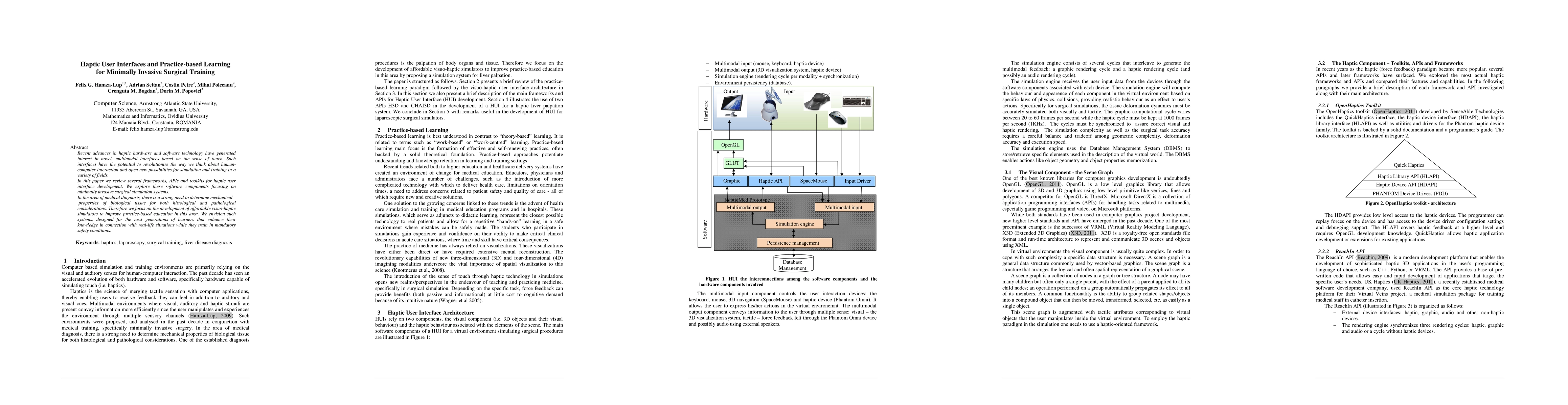 Recent advances in haptic hardware and software technology have generated interest in novel, multimodal interfaces based on the sense of touch. Such interfaces have the potential to revolutionize the way we think about human computer interaction and open new possibilities for simulation and training in a variety of fields. In this paper we review several frameworks, APIs and toolkits for haptic user interface development. We explore these software components focusing on minimally invasive surgical simulation systems. In the area of medical diagnosis, there is a strong need to determine mechanical properties of biological tissue for both histological and pathological considerations. Therefore we focus on the development of affordable visuo-haptic simulators to improve practice-based education in this area. We envision such systems, designed for the next generations of learners that enhance their knowledge in connection with real-life situations while they train in mandatory safety conditions.