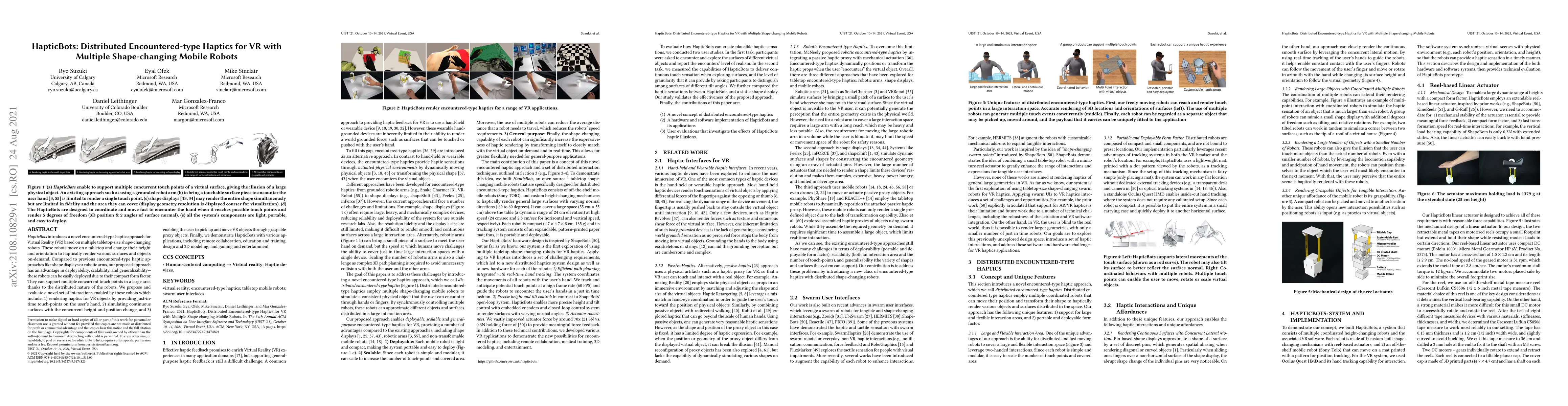 HapticBots leverages multiple tabletop-size shape-changing robots to provide encountered-type haptic feedback in VR, offering scalable and deployable solutions for rendering various surfaces and objects. The robots enable multiple touch points and simulate continuous surfaces, enhancing applications in remote collaboration, education, and gaming.