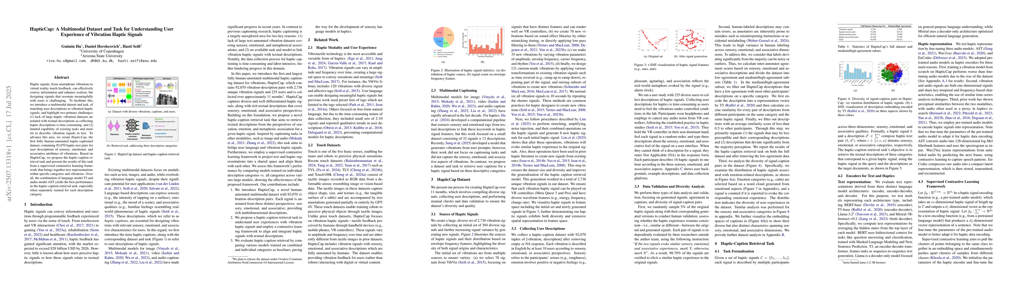 This work is significant as it facilitates the design of meaningful haptic signals by providing a large, annotated dataset and a task for understanding user experience of vibration haptic signals, which is crucial for enhancing realism in applications like smartphone vibrations and virtual reality touch feedback.
