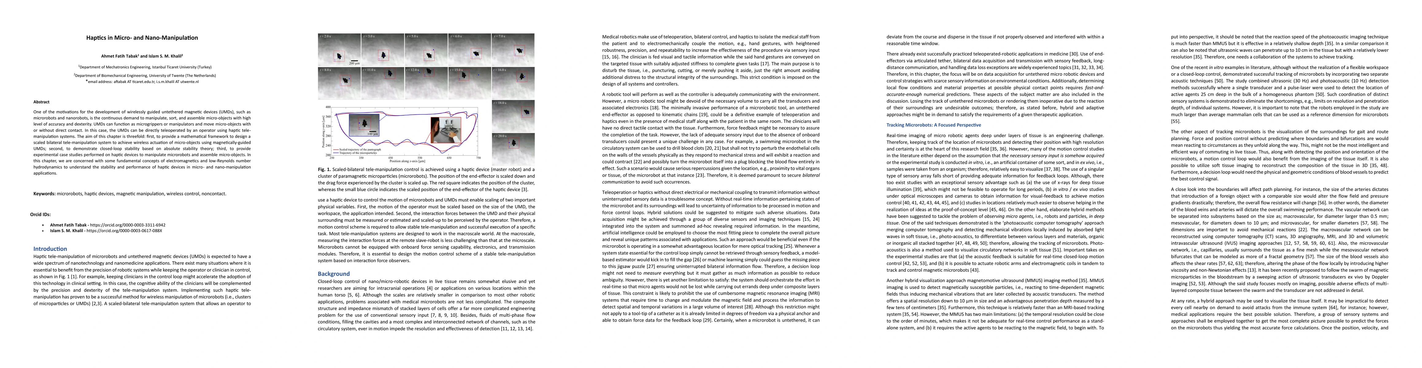 One of the motivations for the development of wirelessly guided untethered magnetic devices (UMDs), such as microrobots and nanorobots, is the continuous demand to manipulate, sort, and assemble micro-objects with high level of accuracy and dexterity. UMDs can function as microgrippers or manipulators and move micro-objects with or without direct contact. In this case, the UMDs can be directly teleoperated by an operator using haptic tele-manipulation systems. The aim of this chapter is threefold: first, to provide a mathematical framework to design a scaled bilateral tele-manipulation system to achieve wireless actuation of micro-objects using magnetically-guided UMDs; second, to demonstrate closed-loop stability based on absolute stability theory; third, to provide experimental case studies performed on haptic devices to manipulate microrobots and assemble micro-objects. In this chapter, we are concerned with some fundamental concepts of electromagnetics and low-Reynolds number hydrodynamics to understand the stability and performance of haptic devices in micro- and nano-manipulation applications.