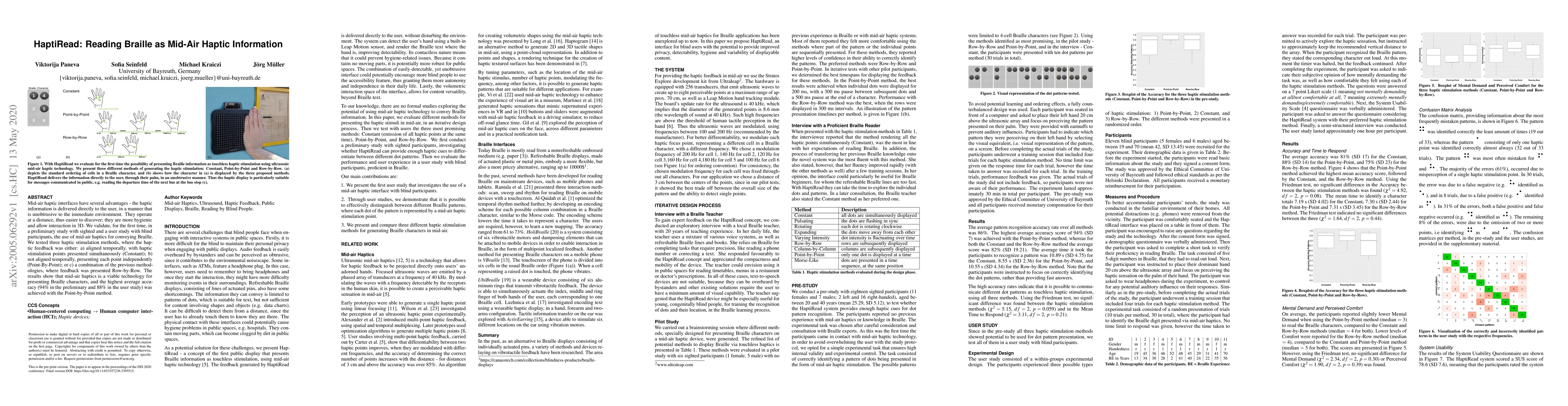 This study explores mid-air haptic interfaces for reading Braille, demonstrating three methods: Constant, Point-by-Point, and Row-by-Row. Results indicate mid-air haptics is effective for Braille, with the Point-by-Point method achieving the highest accuracy.