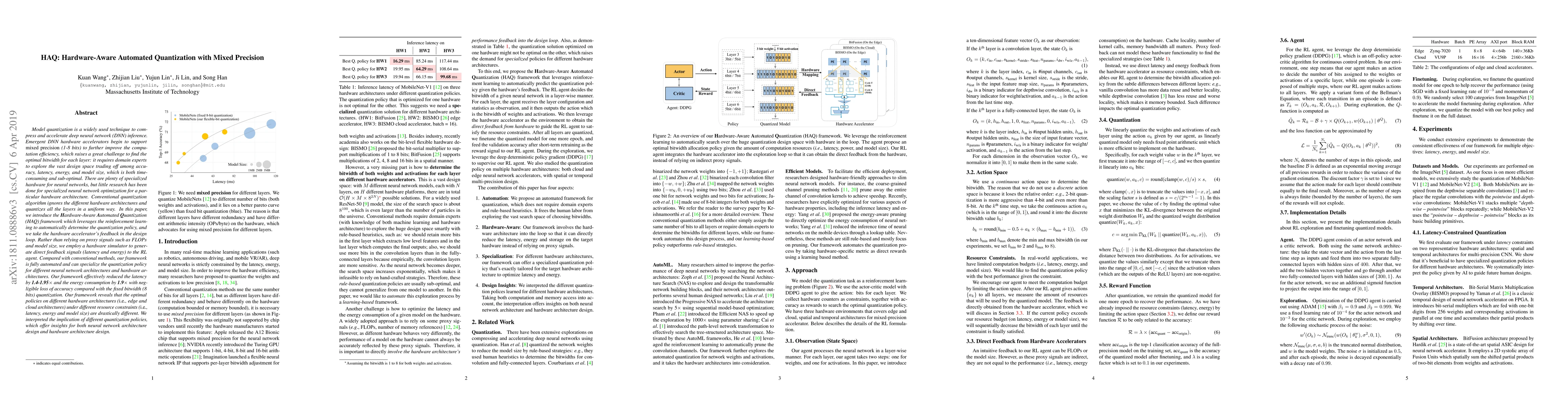 The HAQ framework employs reinforcement learning to automate the quantization of deep neural networks, optimizing bitwidths for mixed precision to reduce latency and energy consumption while maintaining accuracy. This hardware-aware approach uses a simulator for direct feedback, leading to a 1.4-1.95x reduction in latency and a 1.9x reduction in energy compared to fixed bitwidth quantization.