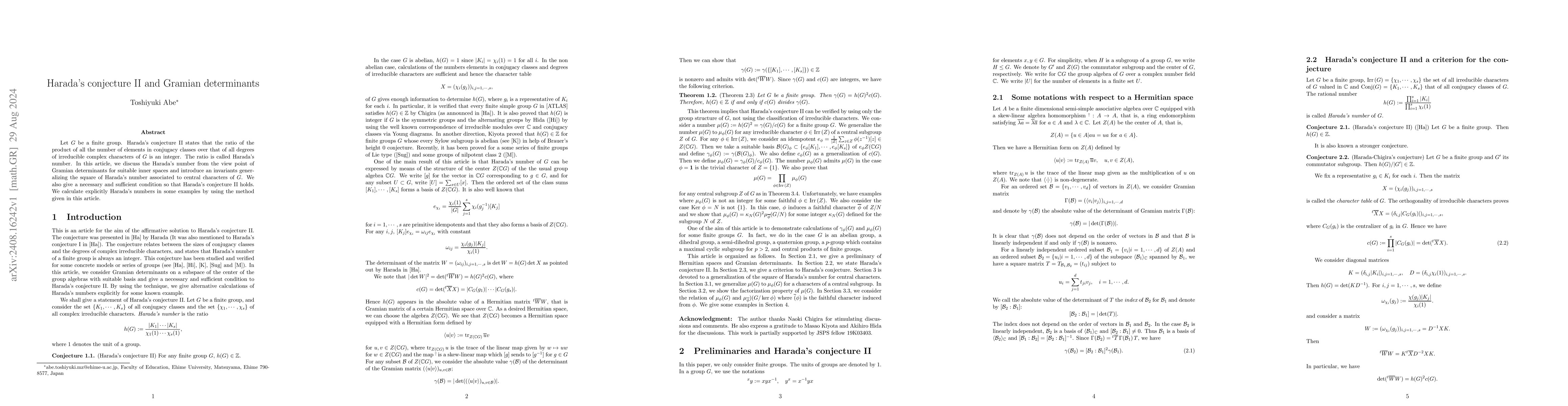 Let $G$ be a finite group. Harada's conjecture II states that the ratio of the product of all the number of elements in conjugacy classes over that of all degrees of irreducible complex characters of $G$ is an integer. The ratio is called Harada's number. In this article, we discuss the Harada's number from the view point of Gramian determinants for suitable inner spaces and introduce an invariants generalizing the square of Harada's number associated to central characters of $G$. We also give a necessary and sufficient condition so that Harada's conjecture II holds. We calculate explicitly Harada's numbers in some examples by using the method given in this article.