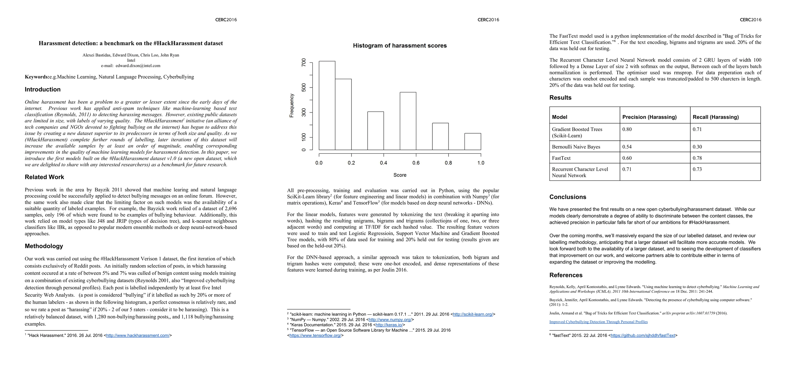 Online harassment has been a problem to a greater or lesser extent since the early days of the internet. Previous work has applied anti-spam techniques like machine-learning based text classification (Reynolds, 2011) to detecting harassing messages. However, existing public datasets are limited in size, with labels of varying quality. The #HackHarassment initiative (an alliance of 1 tech companies and NGOs devoted to fighting bullying on the internet) has begun to address this issue by creating a new dataset superior to its predecssors in terms of both size and quality. As we (#HackHarassment) complete further rounds of labelling, later iterations of this dataset will increase the available samples by at least an order of magnitude, enabling corresponding improvements in the quality of machine learning models for harassment detection. In this paper, we introduce the first models built on the #HackHarassment dataset v1.0 (a new open dataset, which we are delighted to share with any interested researcherss) as a benchmark for future research.