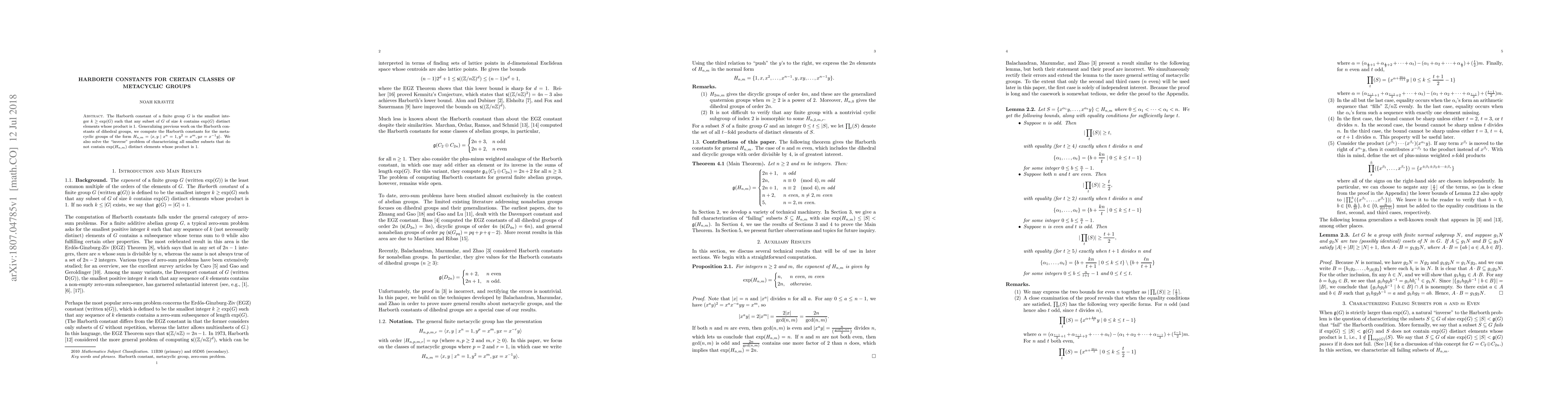 This paper calculates the Harborth constants for metacyclic groups of the form H_{n, m}, extending previous work on dihedral groups. It also identifies subsets that don't meet these constants, solving an 'inverse' problem in group theory.
