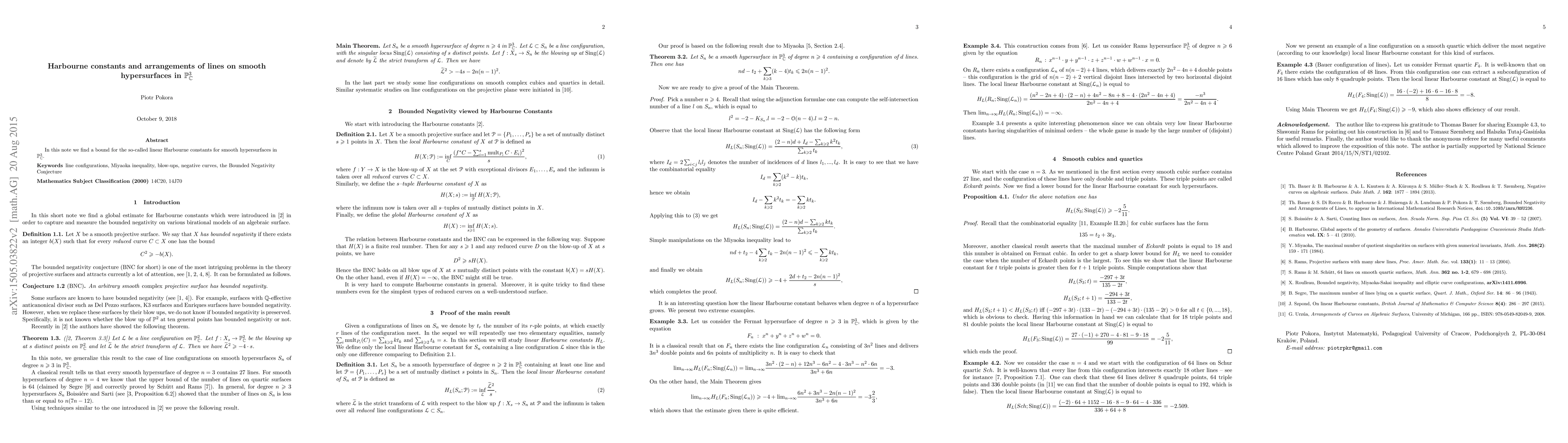 Summary: This paper establishes an upper bound for the global linear Harbourne constants associated with smooth hypersurfaces in complex projective three-space, contributing to the understanding of line arrangements on these surfaces.