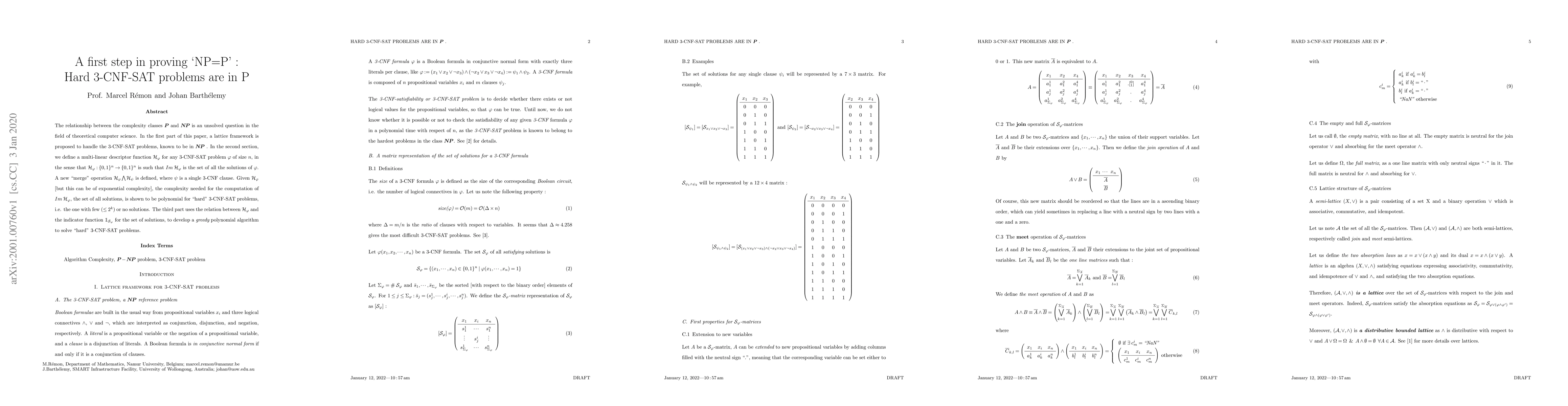 The relationship between the complexity classes $P$ and $NP$ is an unsolved question in the field of theoretical computer science. In the first part of this paper, a lattice framework is proposed to handle the 3-CNF-SAT problems, known to be in $NP$. In the second section, we define a multi-linear descriptor function ${\cal H}_\varphi$ for any 3-CNF-SAT problem $\varphi$ of size $n$, in the sense that ${\cal H}_\varphi : \{0,1\}^n \rightarrow \{0,1\}^n$ is such that $Im \; {\cal H}_\varphi$ is the set of all the solutions of $\varphi$. A new merge operation ${\cal H}_\varphi \bigwedge {\cal H}_{\psi}$ is defined, where $\psi$ is a single 3-CNF clause. Given ${\cal H}_\varphi$ [but this can be of exponential complexity], the complexity needed for the computation of $Im \; {\cal H}_\varphi$, the set of all solutions, is shown to be polynomial for hard 3-CNF-SAT problems, i.e. the one with few ($\leq 2^k$) or no solutions. The third part uses the relation between ${\cal H}_\varphi$ and the indicator function $\mathbb{1}_{{\cal S}_\varphi}$ for the set of solutions, to develop a greedy polynomial algorithm to solve hard 3-CNF-SAT problems.