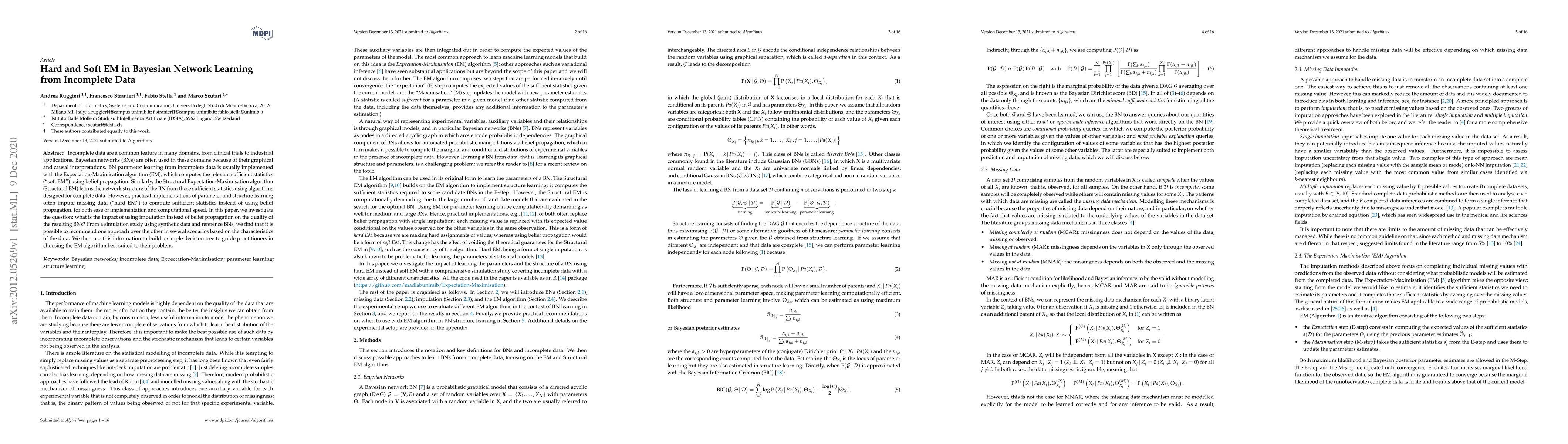 Incomplete data are a common feature in many domains, from clinical trials to industrial applications. Bayesian networks (BNs) are often used in these domains because of their graphical and causal interpretations. BN parameter learning from incomplete data is usually implemented with the Expectation-Maximisation algorithm (EM), which computes the relevant sufficient statistics ("soft EM") using belief propagation. Similarly, the Structural Expectation-Maximisation algorithm (Structural EM) learns the network structure of the BN from those sufficient statistics using algorithms designed for complete data. However, practical implementations of parameter and structure learning often impute missing data ("hard EM") to compute sufficient statistics instead of using belief propagation, for both ease of implementation and computational speed. In this paper, we investigate the question: what is the impact of using imputation instead of belief propagation on the quality of the resulting BNs? From a simulation study using synthetic data and reference BNs, we find that it is possible to recommend one approach over the other in several scenarios based on the characteristics of the data. We then use this information to build a simple decision tree to guide practitioners in choosing the EM algorithm best suited to their problem.