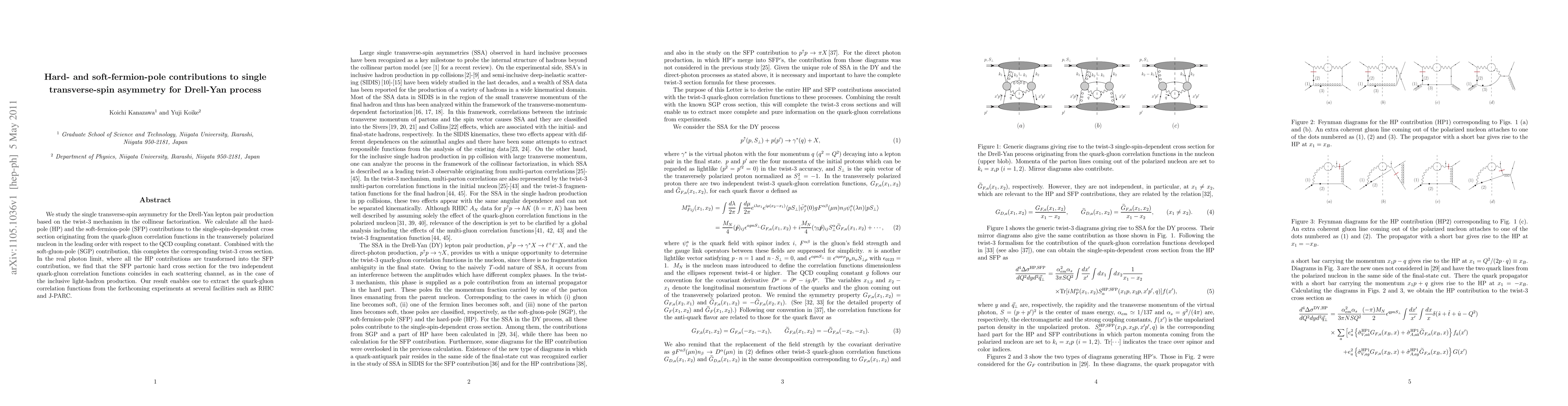 This paper calculates hard-pole and soft-fermion-pole contributions to the single transverse-spin asymmetry in Drell-Yan processes, completing the twist-3 cross section. The study reveals that in the real photon limit, the SFP partonic hard cross section for quark-gluon correlations aligns with inclusive light-hadron production, aiding future extractions of these functions from experiments like RHIC and J-PARC.