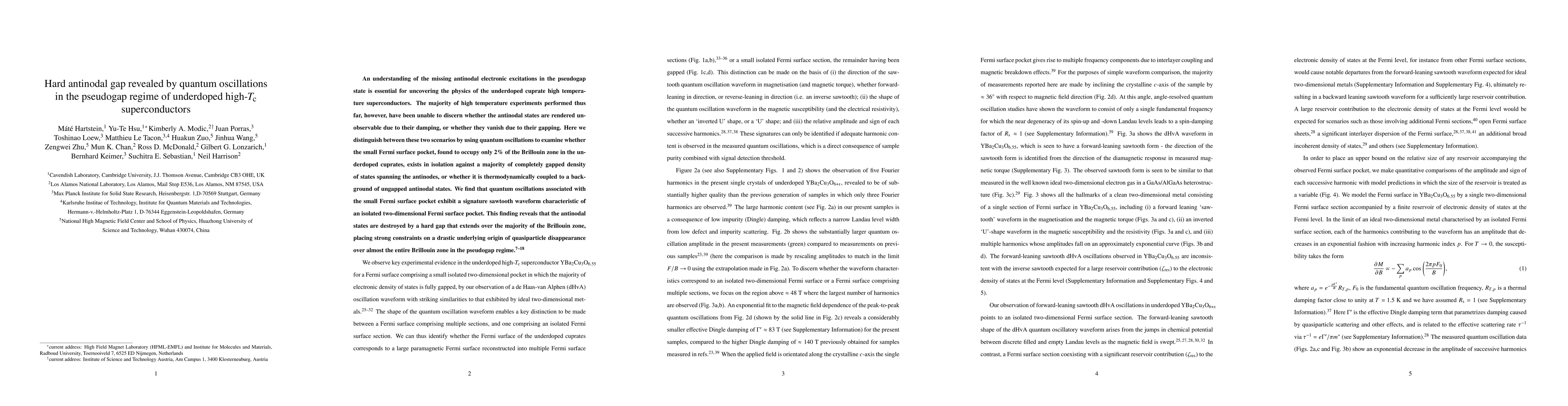 This study reveals that antinodal electronic excitations in underdoped high-$T_{\rm c}$ superconductors are completely gapped, as evidenced by the sawtooth waveform in quantum oscillations, indicating a hard antinodal gap in the pseudogap regime. This finding rules out damping as the cause and suggests a significant underlying gapping mechanism.