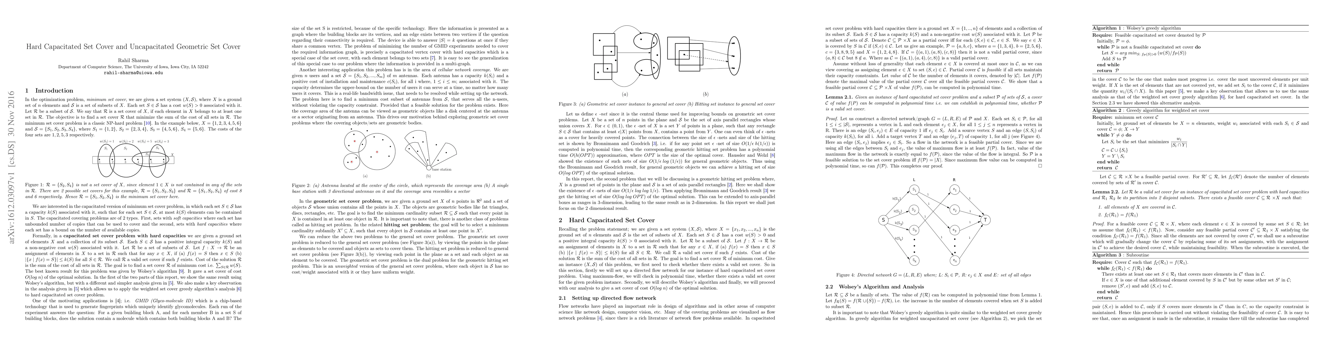 This paper presents a simpler analysis achieving a logarithmic approximation for the hard capacitated set cover problem, building on Wolsey's work. It also addresses the uncapacitated geometric set cover problem, demonstrating the computation of epsilon-nets and hitting sets of optimal size in polynomial time.