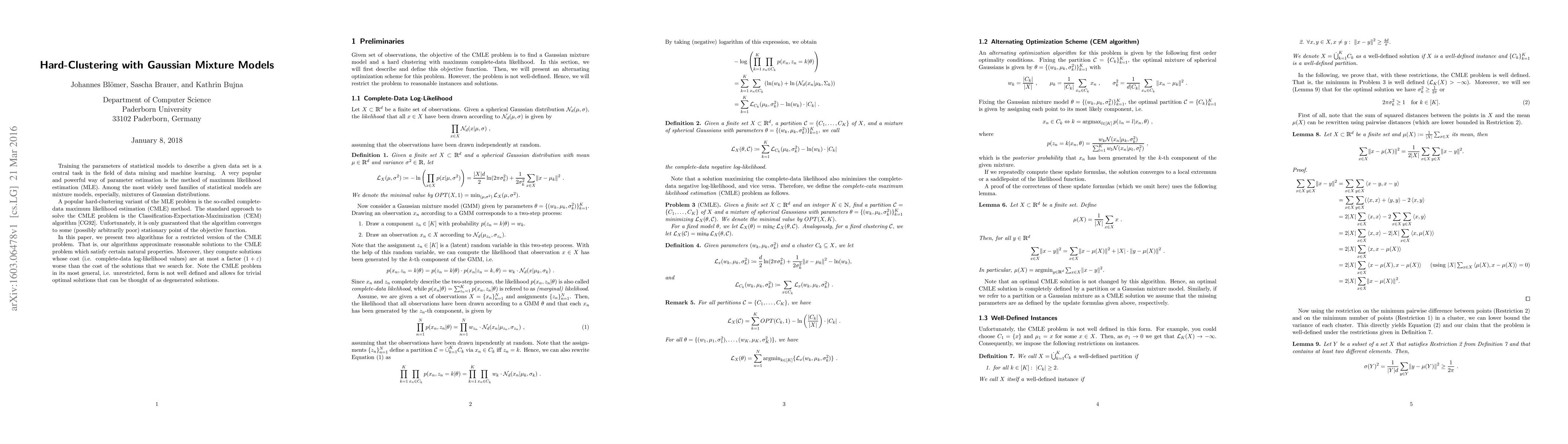 Training the parameters of statistical models to describe a given data set is a central task in the field of data mining and machine learning. A very popular and powerful way of parameter estimation is the method of maximum likelihood estimation (MLE). Among the most widely used families of statistical models are mixture models, especially, mixtures of Gaussian distributions. A popular hard-clustering variant of the MLE problem is the so-called complete-data maximum likelihood estimation (CMLE) method. The standard approach to solve the CMLE problem is the Classification-Expectation-Maximization (CEM) algorithm. Unfortunately, it is only guaranteed that the algorithm converges to some (possibly arbitrarily poor) stationary point of the objective function. In this paper, we present two algorithms for a restricted version of the CMLE problem. That is, our algorithms approximate reasonable solutions to the CMLE problem which satisfy certain natural properties. Moreover, they compute solutions whose cost (i.e. complete-data log-likelihood values) are at most a factor $(1+\epsilon)$ worse than the cost of the solutions that we search for. Note the CMLE problem in its most general, i.e. unrestricted, form is not well defined and allows for trivial optimal solutions that can be thought of as degenerated solutions.
