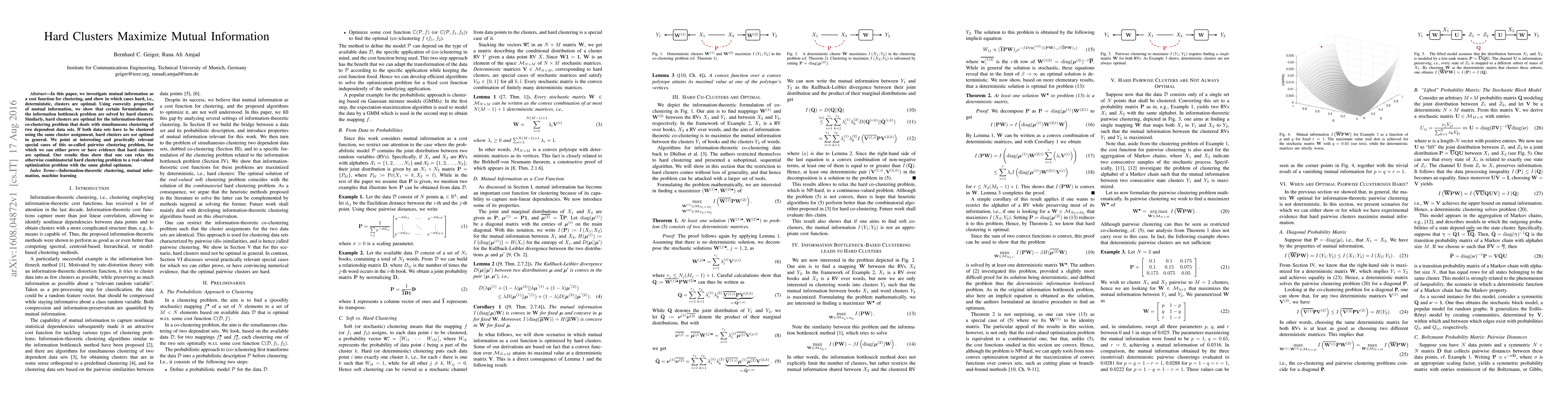 This paper explores mutual information as a clustering cost function, demonstrating that hard clusters maximize mutual information in certain scenarios, particularly in the information bottleneck problem and co-clustering. It also identifies special cases where hard clusters are optimal for pairwise clustering despite general inefficiency.