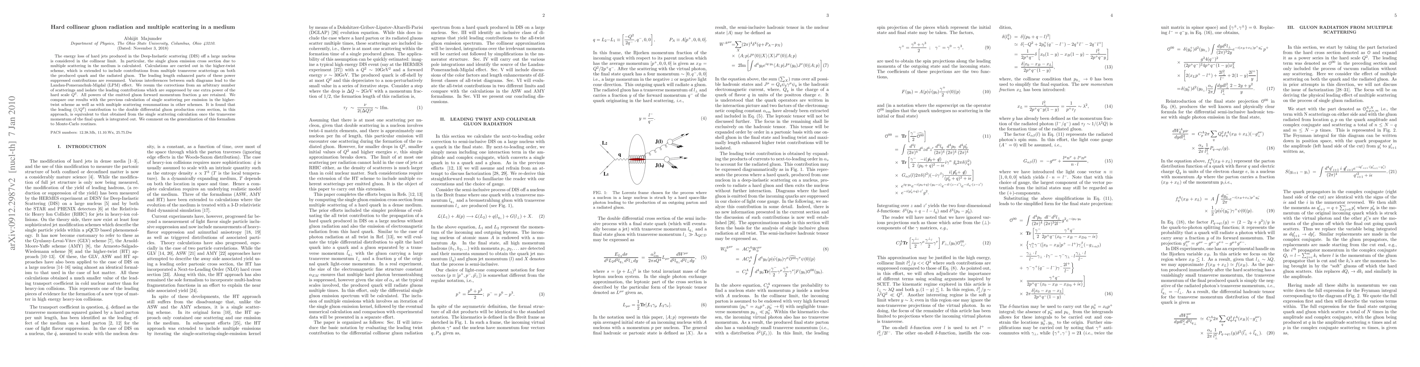 The energy loss of hard jets produced in the Deep-Inelastic scattering (DIS) off a large nucleus is considered in the collinear limit. In particular, the single gluon emission cross section due to multiple scattering in the medium is calculated. Calculations are carried out in the higher-twist scheme, which is extended to include contributions from multiple transverse scatterings on both the produced quark and the radiated gluon. The leading length enhanced parts of these power suppressed contributions are resummed. Various interferences between such diagrams lead to the Landau-Pomeranchuk-Migdal (LPM) effect. We resum the corrections from an arbitrary number of scatterings and isolate the leading contributions which are suppressed by one extra power of the hard scale $Q^{2}$. All powers of the emitted gluon forward momentum fraction $y$ are retained. We compare our results with the previous calculation of single scattering per emission in the higher-twist scheme as well as with multiple scattering resummations in other schemes. It is found that the leading ($1/Q^2$) contribution to the double differential gluon production cross section, in this approach, is equivalent to that obtained from the single scattering calculation once the transverse momentum of the final quark is integrated out. We comment on the generalization of this formalism to Monte-Carlo routines.