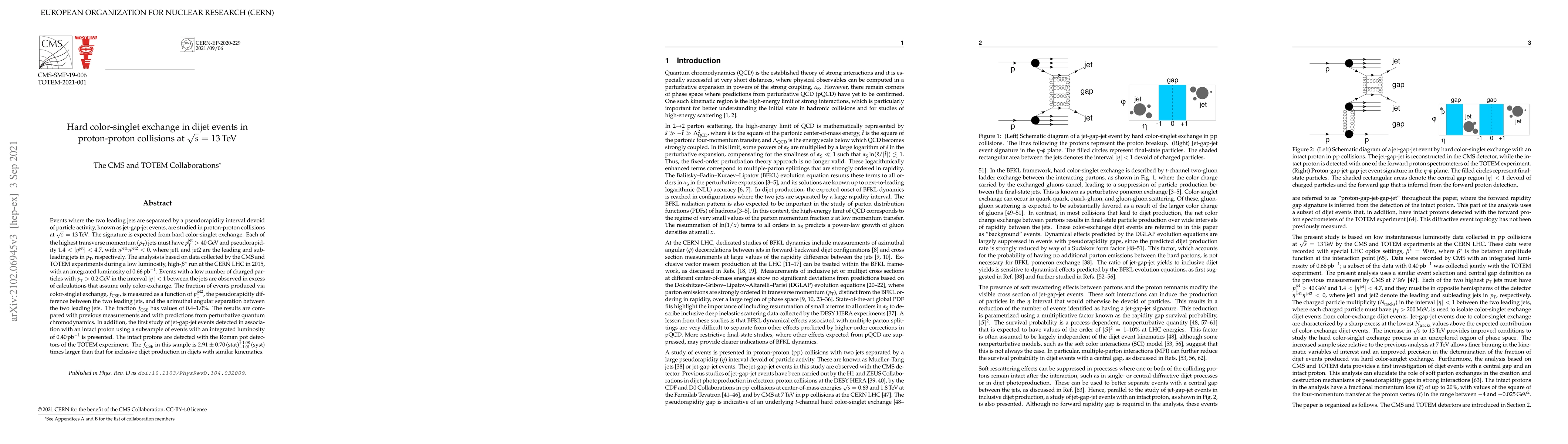 This paper investigates jet-gap-jet events in proton-proton collisions at 13 TeV, where leading jets are separated by a particle-free region, indicating hard color-singlet exchange. The CMS and TOTEM experiments observed an excess of such events, measuring a color-singlet exchange fraction of 0.4-1.0%, and presenting the first study of these events in association with intact protons, showing a significantly higher fraction.