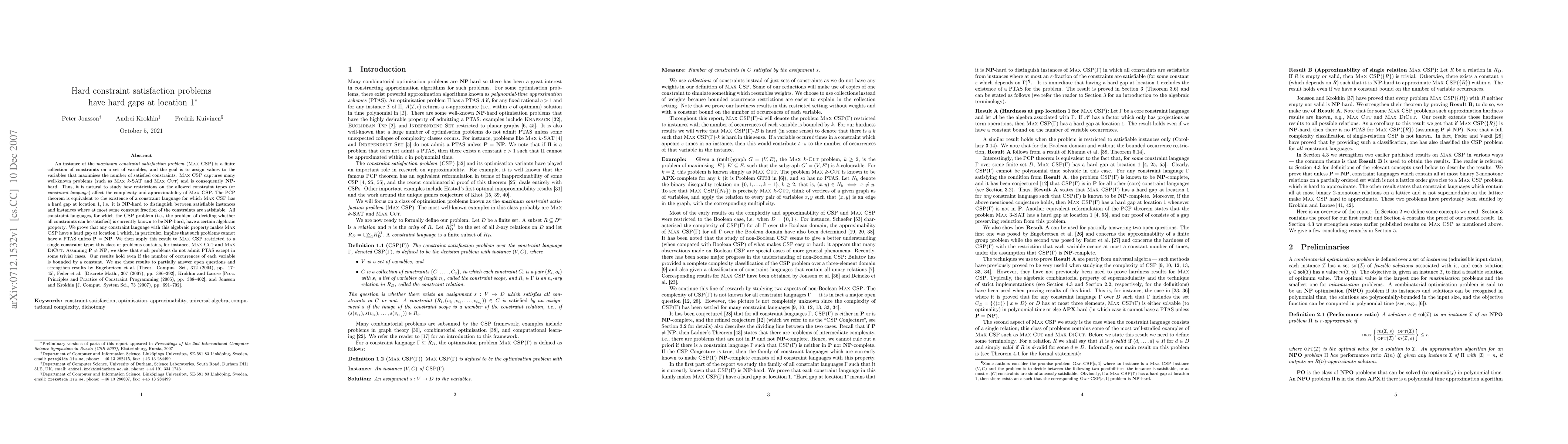 Research shows that certain constraint satisfaction problems have hard gaps at location 1, meaning it's difficult to distinguish between satisfiable instances and those with a limited number of satisfied constraints, implying some problems cannot be approximated well unless P=NP.