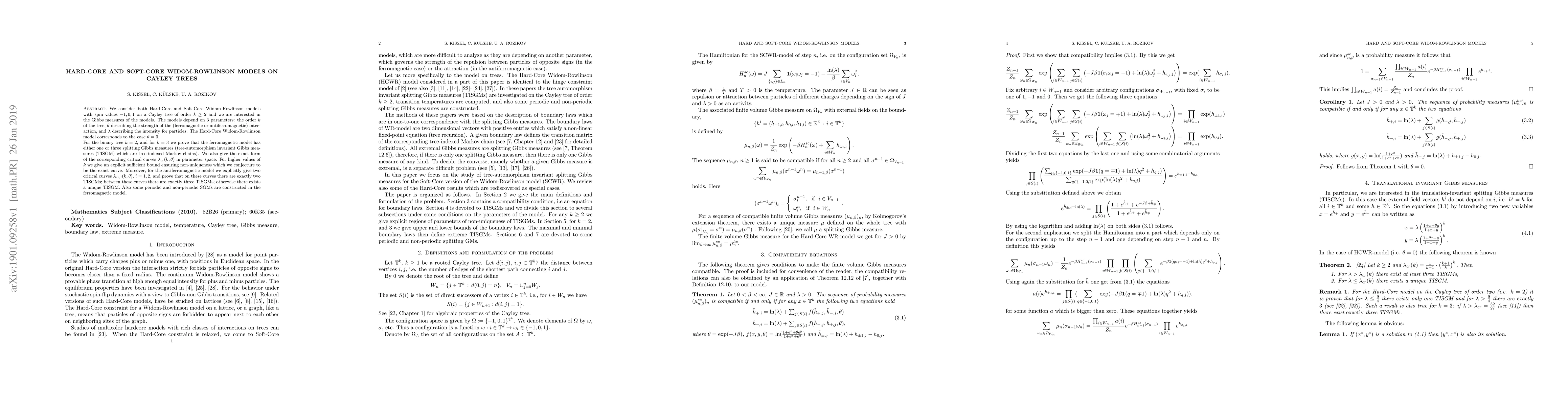 We consider both Hard-Core and Soft-Core Widom-Rowlinson models with spin values $-1,0,1$ on a Cayley tree of order $k\geq 2$ and we are interested in the Gibbs measures of the models. The models depend on 3 parameters: the order $k$ of the tree, $\theta$ describing the strength of the (ferromagnetic or antiferromagnetic) interaction, and $\lambda$ describing the intensity for particles. The Hard-Core Widom-Rowlinson model corresponds to the case $\theta=0$. For the binary tree $k=2$, and for $k=3$ we prove that the ferromagnetic model has either one or three splitting Gibbs measures (tree-automorphism invariant Gibbs measures (TISGM) which are tree-indexed Markov chains). We also give the exact form of the corresponding critical curves in parameter space. For higher values of $k$ we give an explicit sufficient bound ensuring non-uniqueness which we conjecture to be the exact curve. Moreover, for the antiferromagnetic model we explicitly give two critical curves and prove that on these curves there are exactly two TISGMs; between these curves there are exactly three TISGMs; otherwise there exists a unique TISGM. Also some periodic and non-periodic SGMs are constructed in the ferromagnetic model.