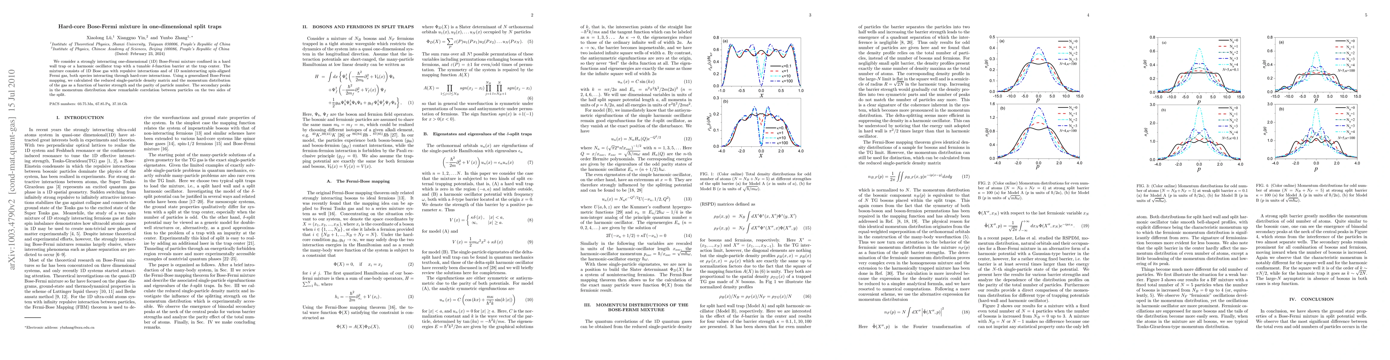 This paper studies a one-dimensional Bose-Fermi mixture with hard-core interactions in split traps, utilizing a generalized Bose-Fermi mapping to analyze the reduced single-particle density matrix and momentum distribution. It reveals notable correlations between particles on opposite sides of the trap, evidenced by secondary peaks in the momentum distribution.