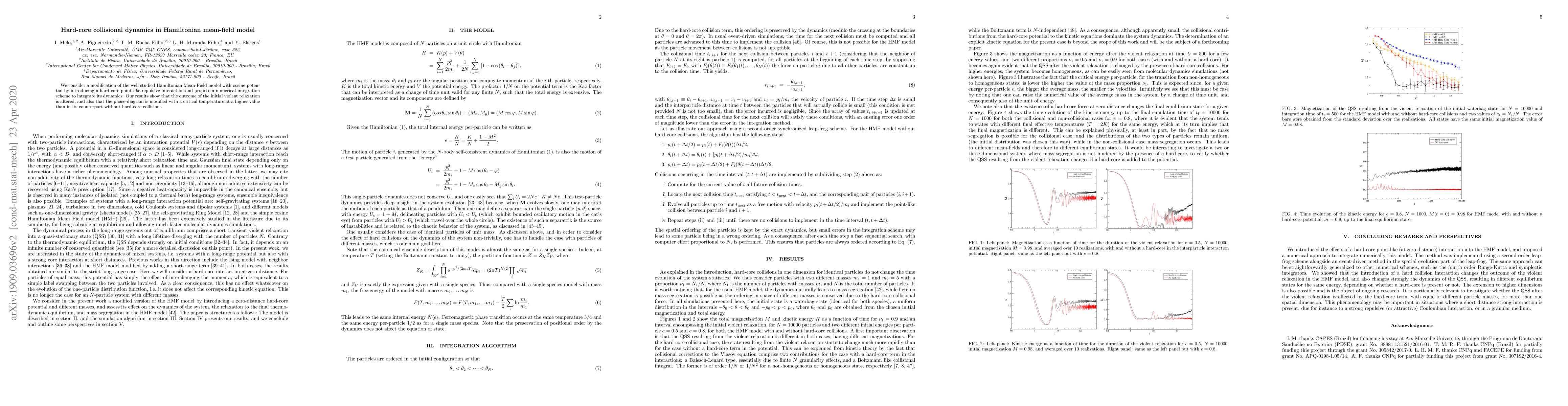 This paper modifies the Hamiltonian Mean-Field model by adding hard-core repulsive interactions and develops a numerical scheme to study its dynamics. The results indicate that the violent relaxation process and the phase diagram are significantly altered, including a higher critical temperature compared to the non-collisional model.