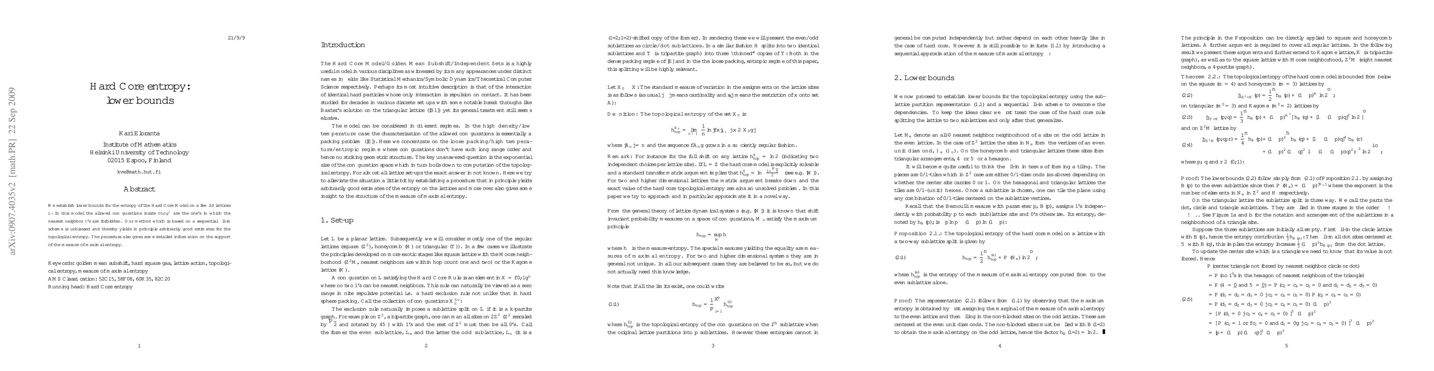 This paper sets lower bounds for entropy in the Hard Core Model on specific 2D lattices, providing a new method to estimate topological entropy with unbiased results.