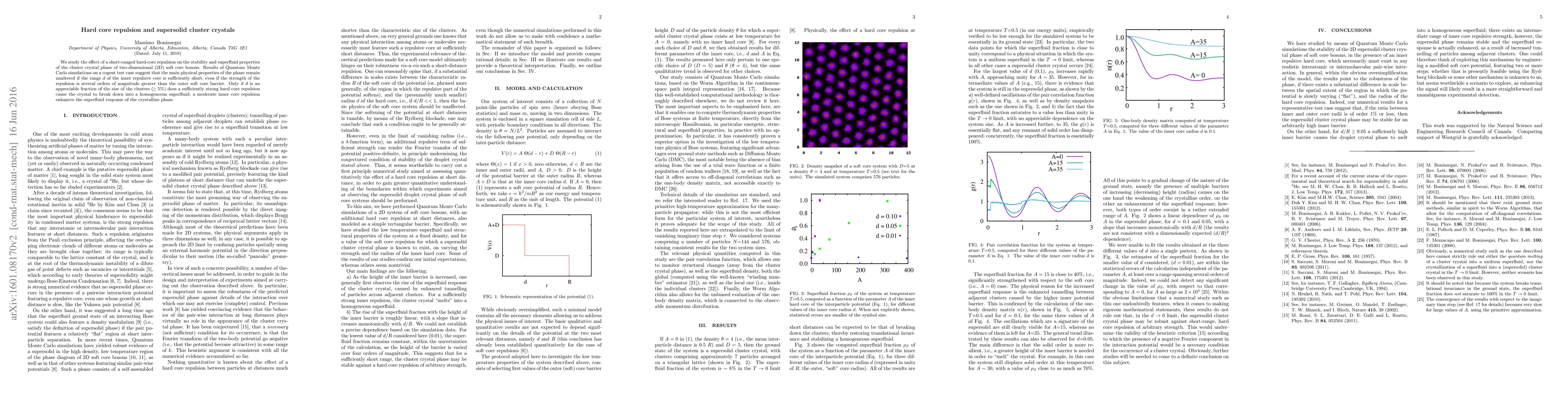 We study the effect of a short-ranged hard-core repulsion on the stability and superfluid properties of the cluster crystal phase of two-dimensional (2D) soft core bosons. Results of Quantum Monte Carlo simulations on a cogent test case suggest that the main physical properties of the phase remain unaltered if the range d of the inner repulsive core is sufficiently short, even if the strength of the repulsion is several orders of magnitude greater than the outer soft core barrier. Only if d is an appreciable fraction of the size of the clusters (> 5%) does a sufficiently strong hard core repulsion cause the crystal to break down into a homogeneous superfluid; a moderate inner core repulsion enhances the superfluid response of the crystalline phase.