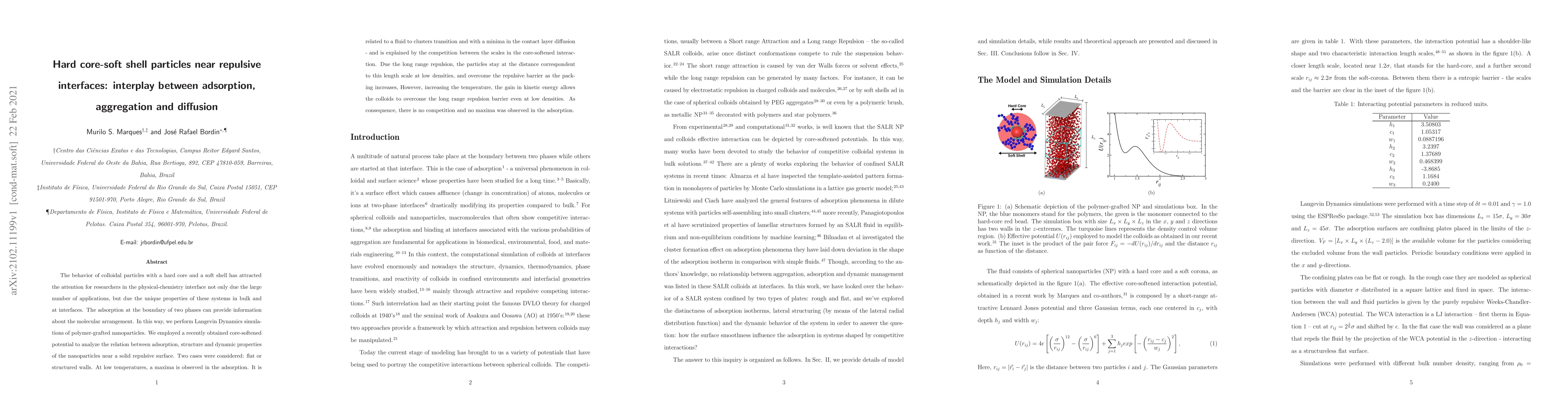 This study investigates the behavior of polymer-grafted nanoparticles with hard cores and soft shells near repulsive interfaces using Langevin Dynamics simulations. At low temperatures, adsorption peaks due to a fluid-to-cluster transition and reduced diffusion, explained by core-softened interactions. Increasing temperature allows particles to overcome repulsion, eliminating adsorption maxima.